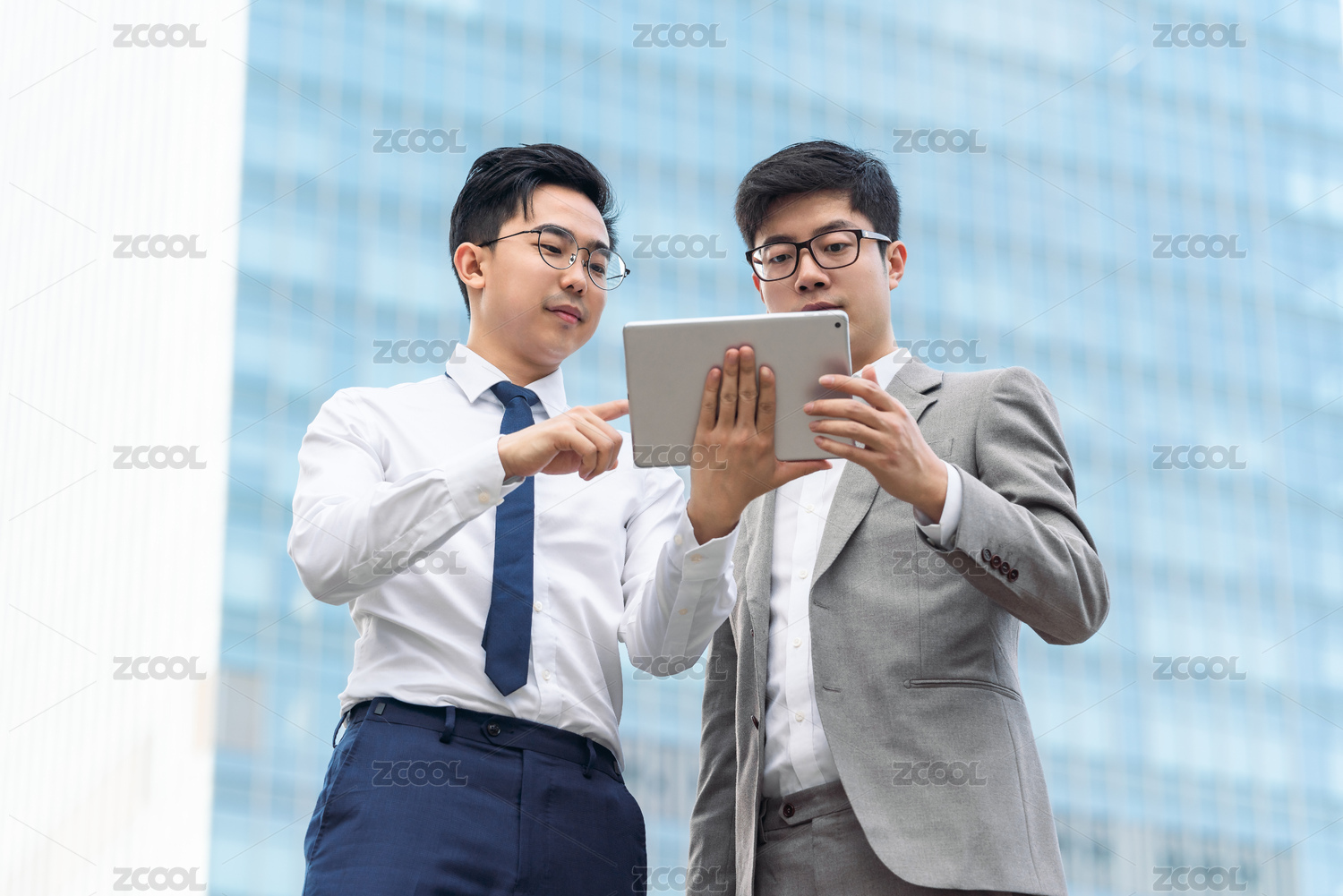 亞洲商務(wù)人士手持平板電腦在戶(hù)外交談