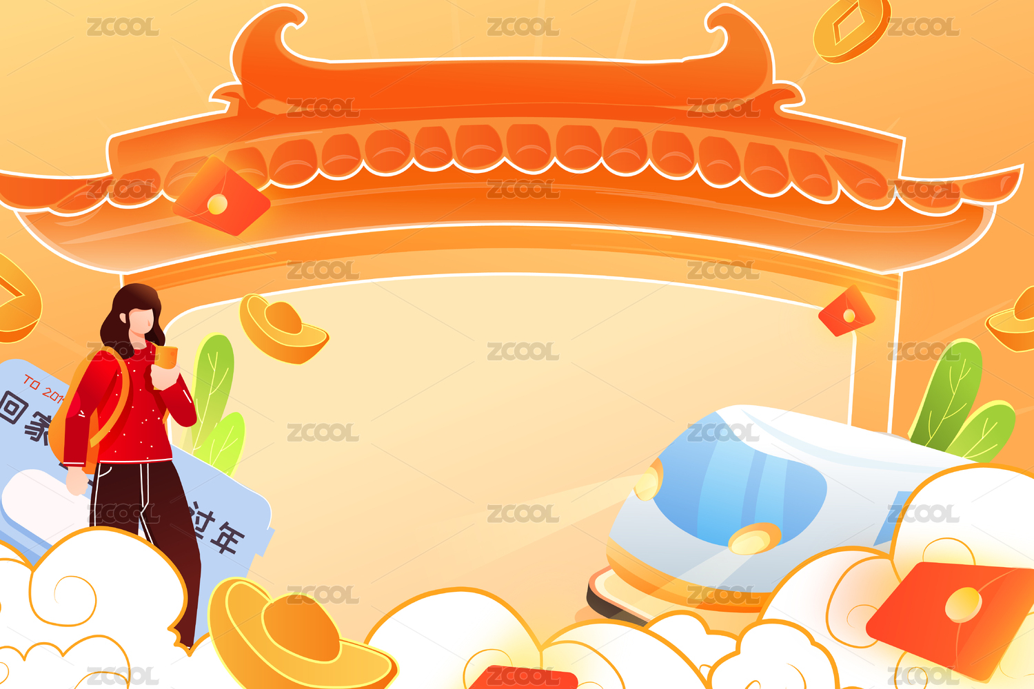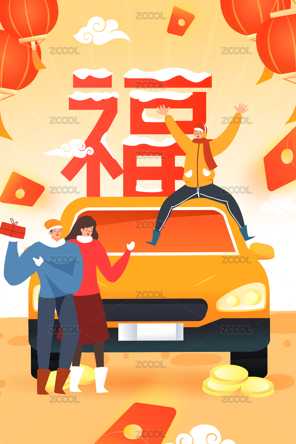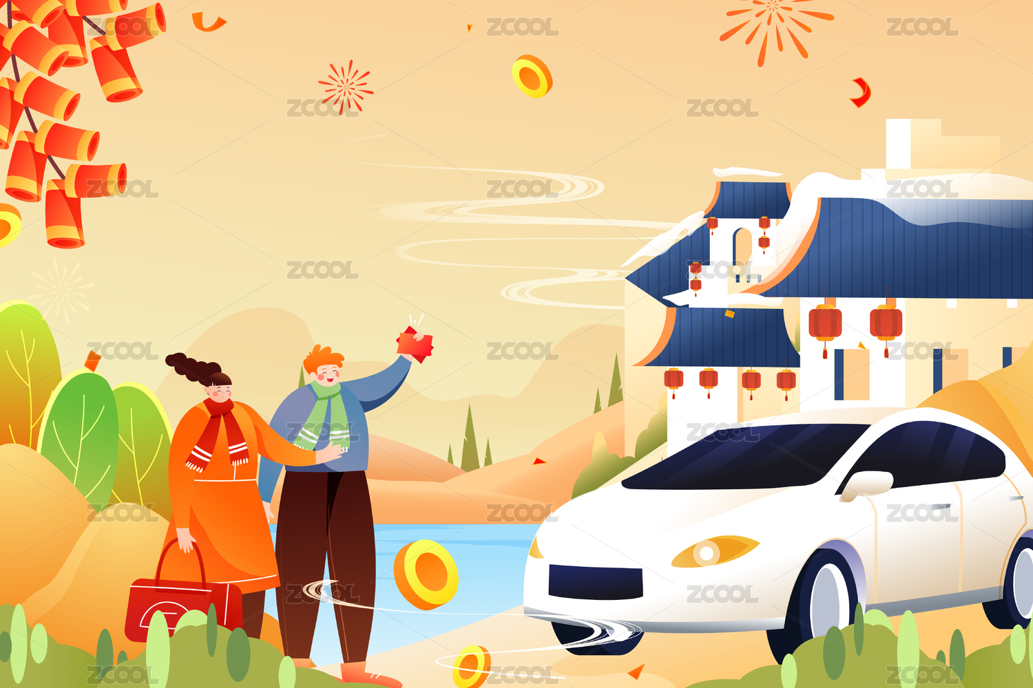 卡通新年回家過年出行禮包汽車活動矢量背景插畫
