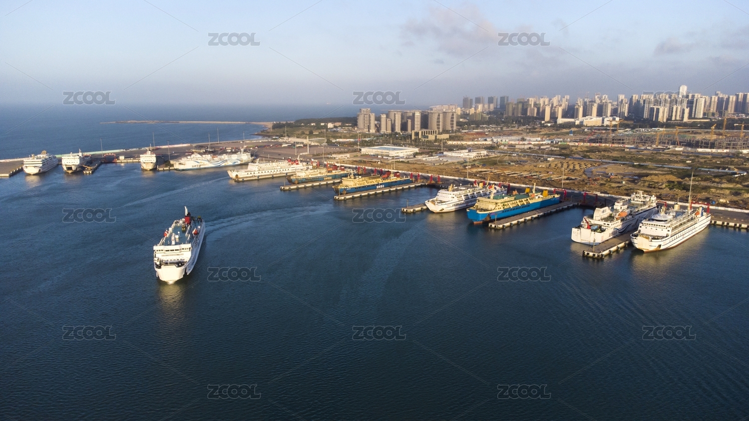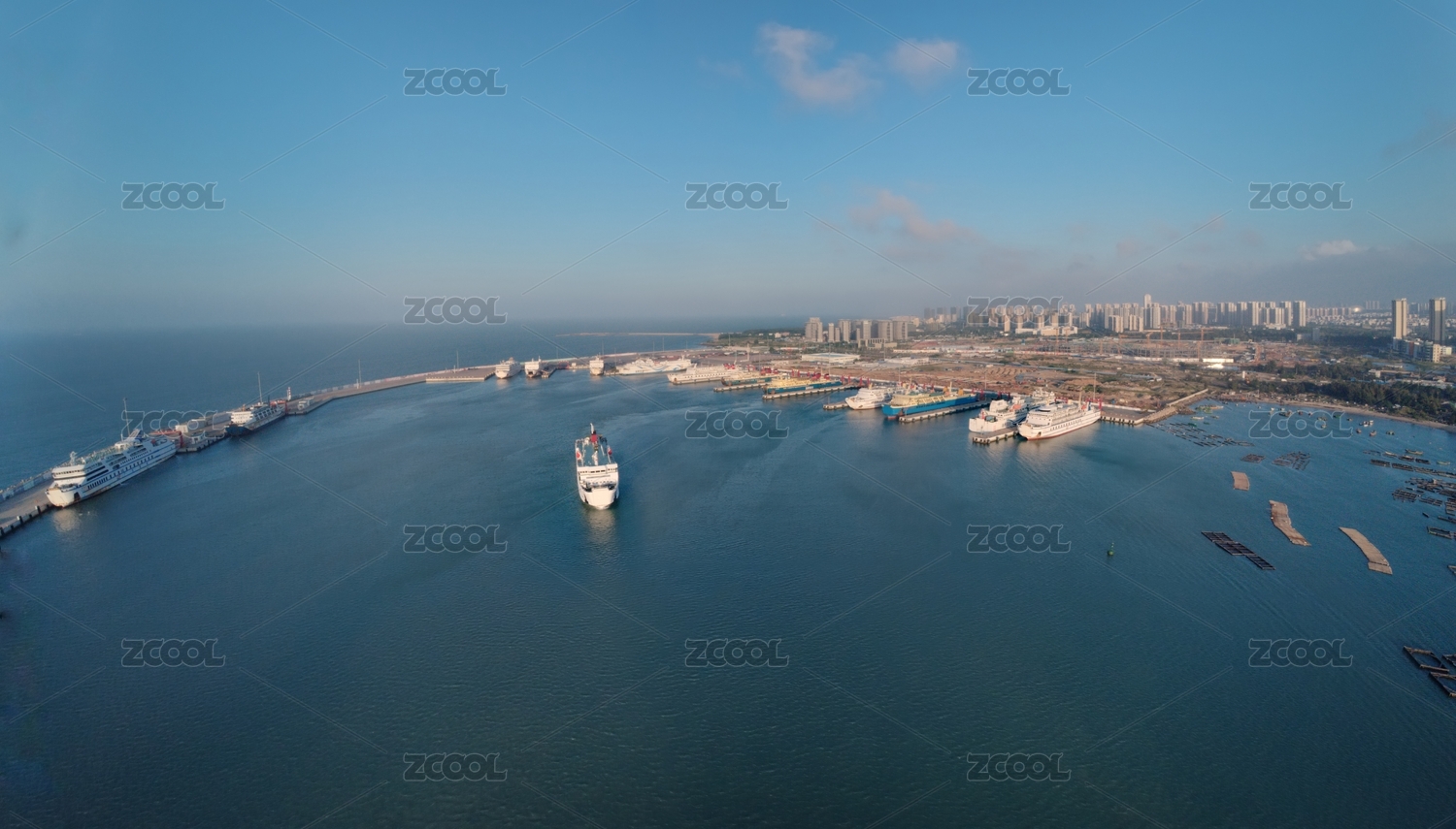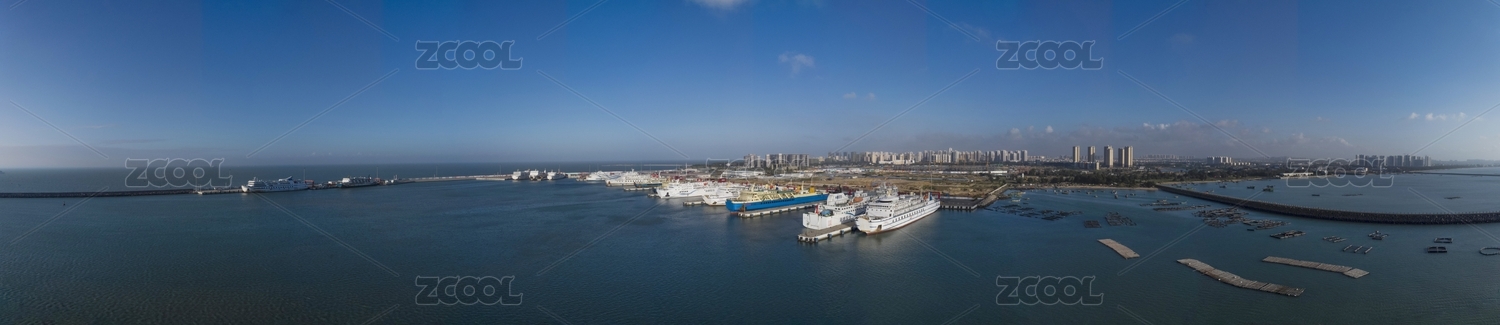 航拍海口新港內(nèi)停泊的船隊和航行的船只