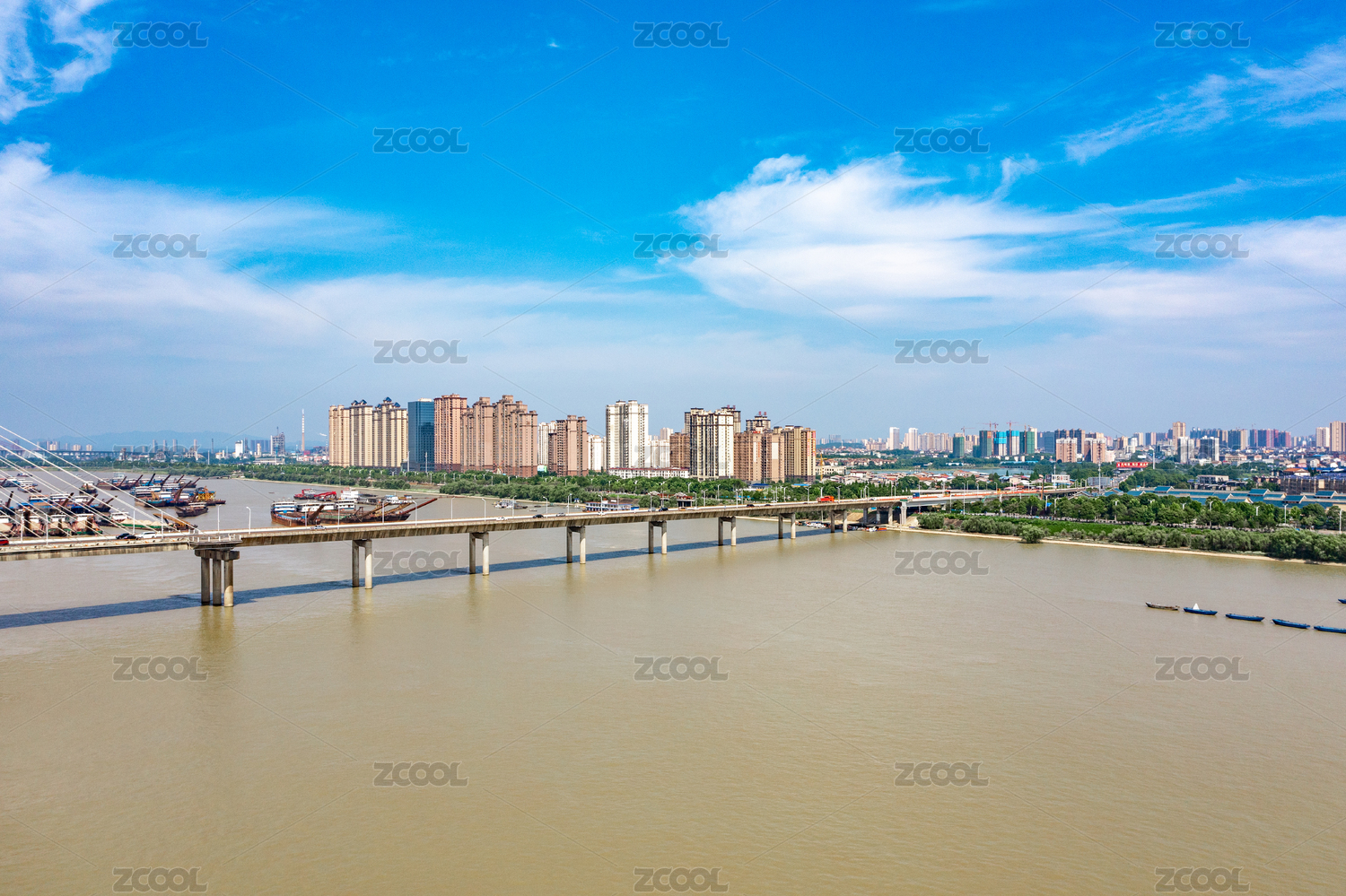 航拍中國湖南岳陽洞庭湖大橋與船隊