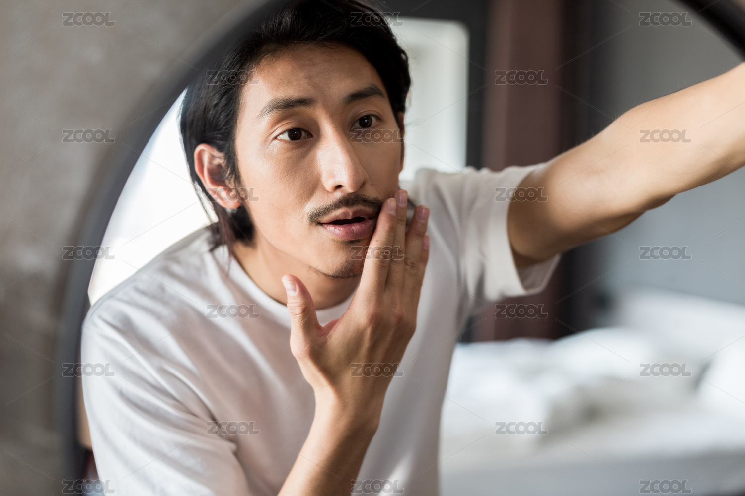 照鏡子看脖子皺紋的女人手繪插畫(huà)