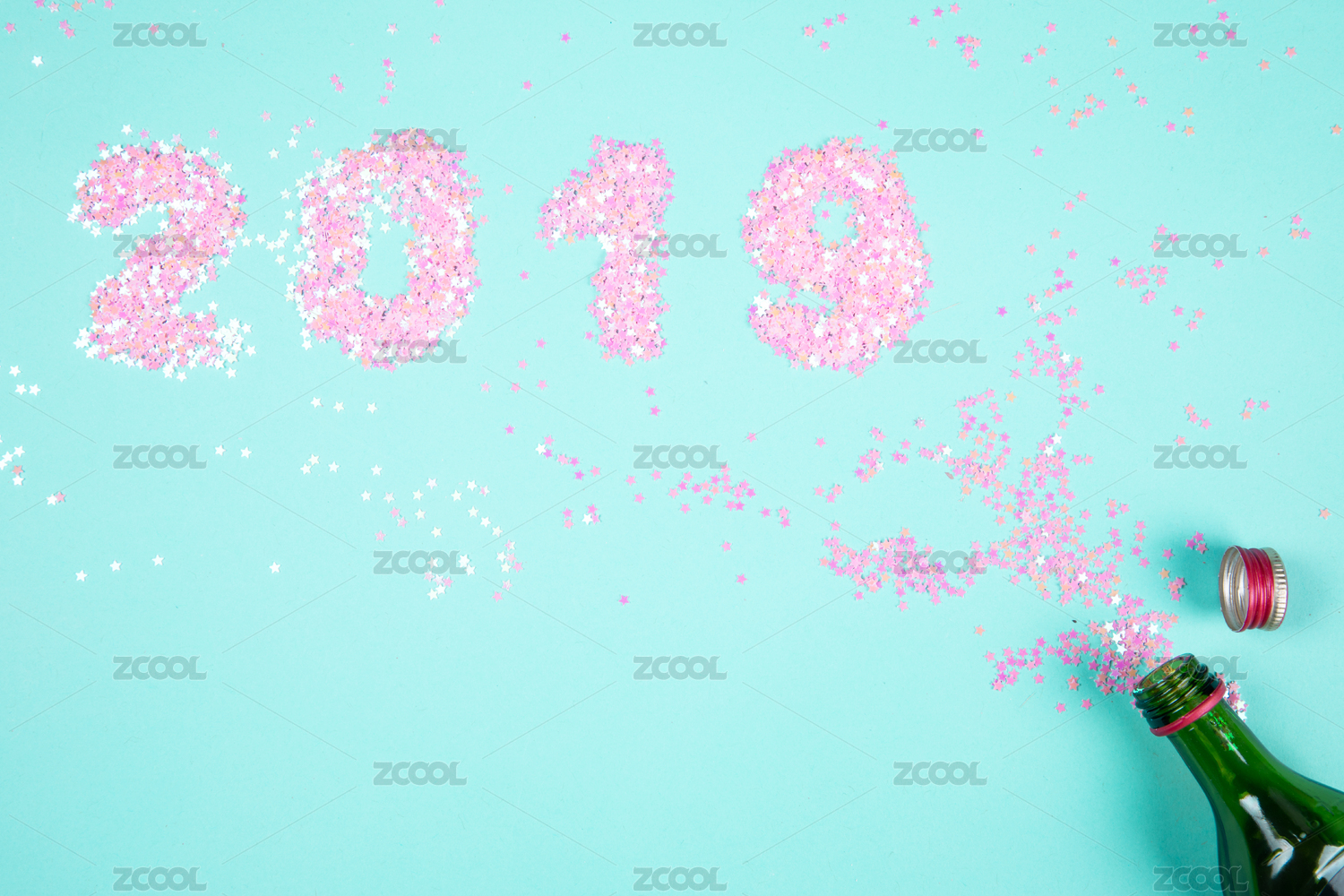 特寫正上方視角海藍色背景閃光亮片裝飾2019新年圖