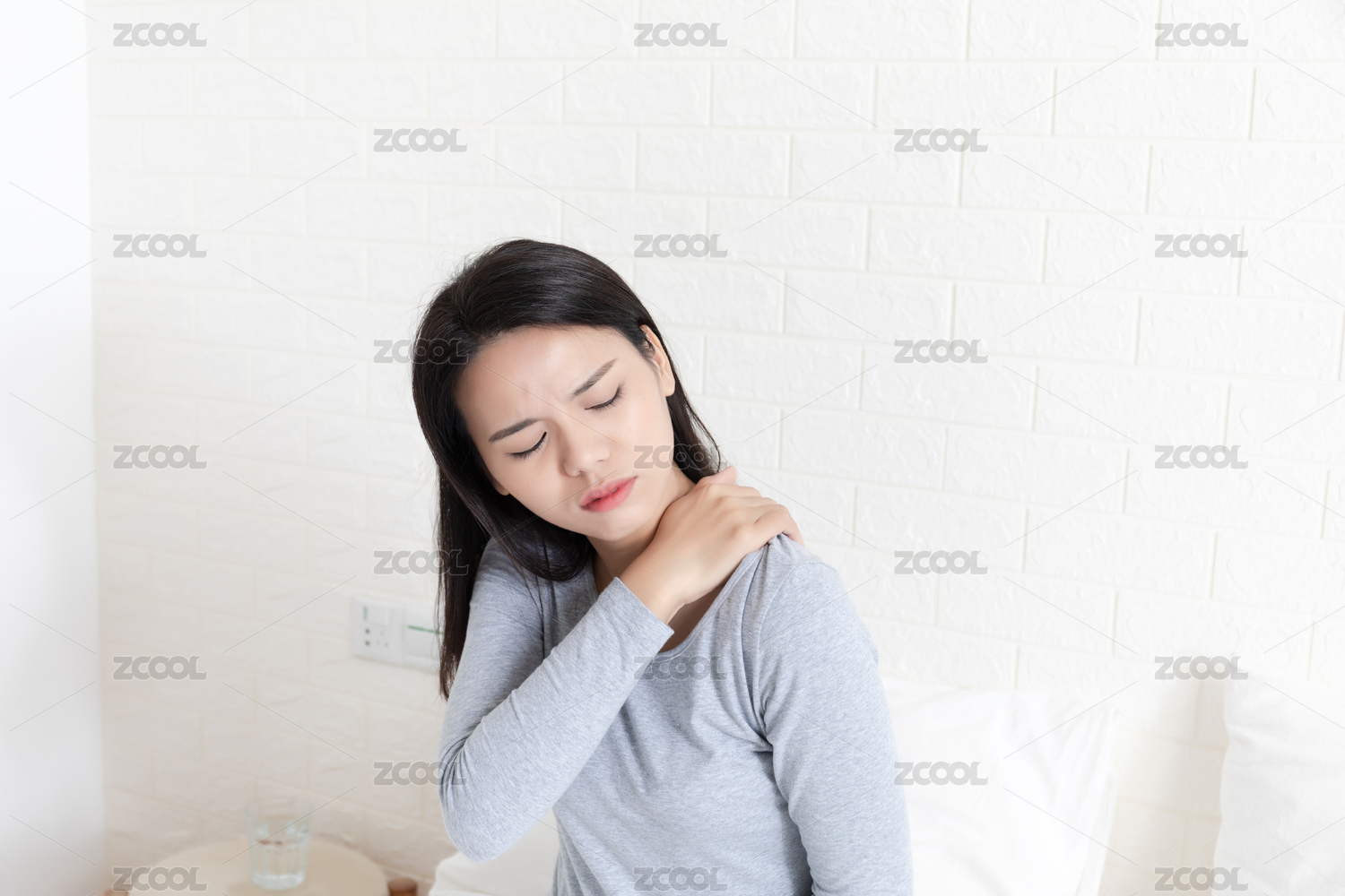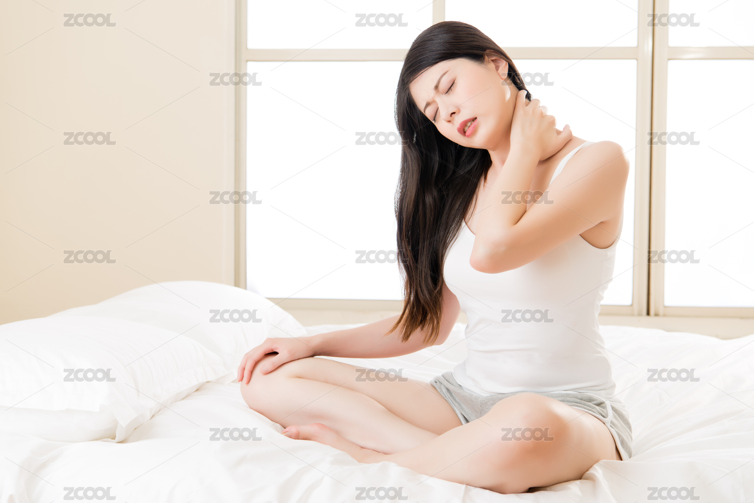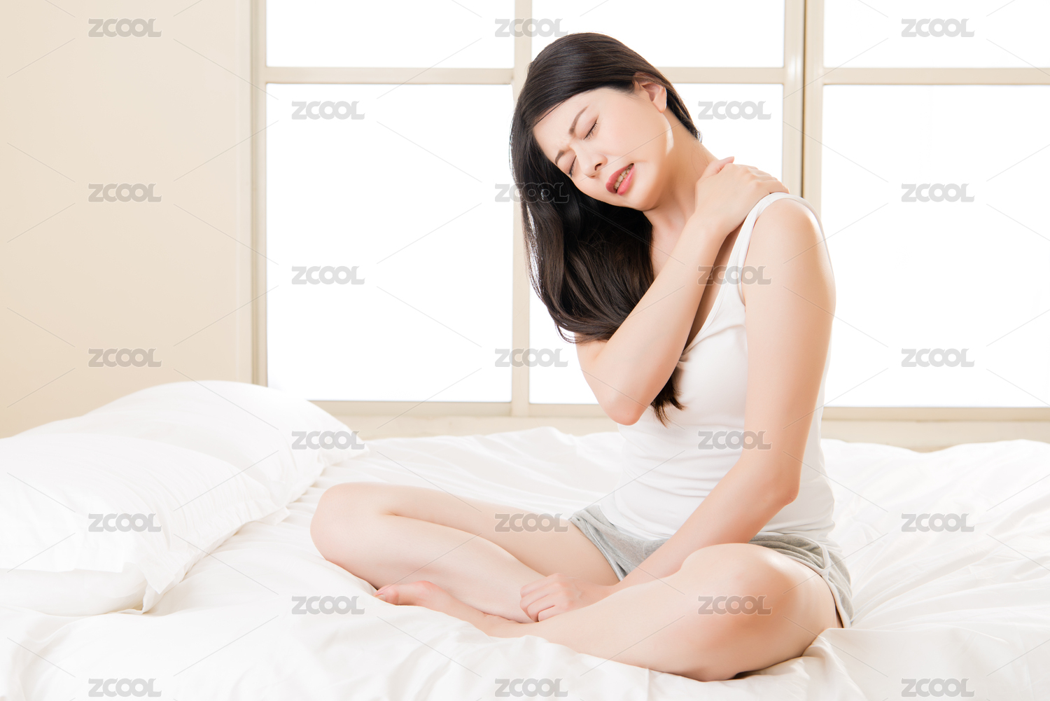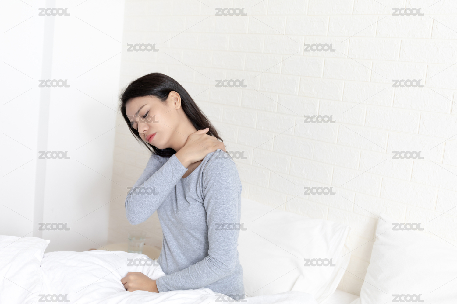 亞洲美麗的痛苦肩頸酸痛疲憊的坐在了床上。臥室背景