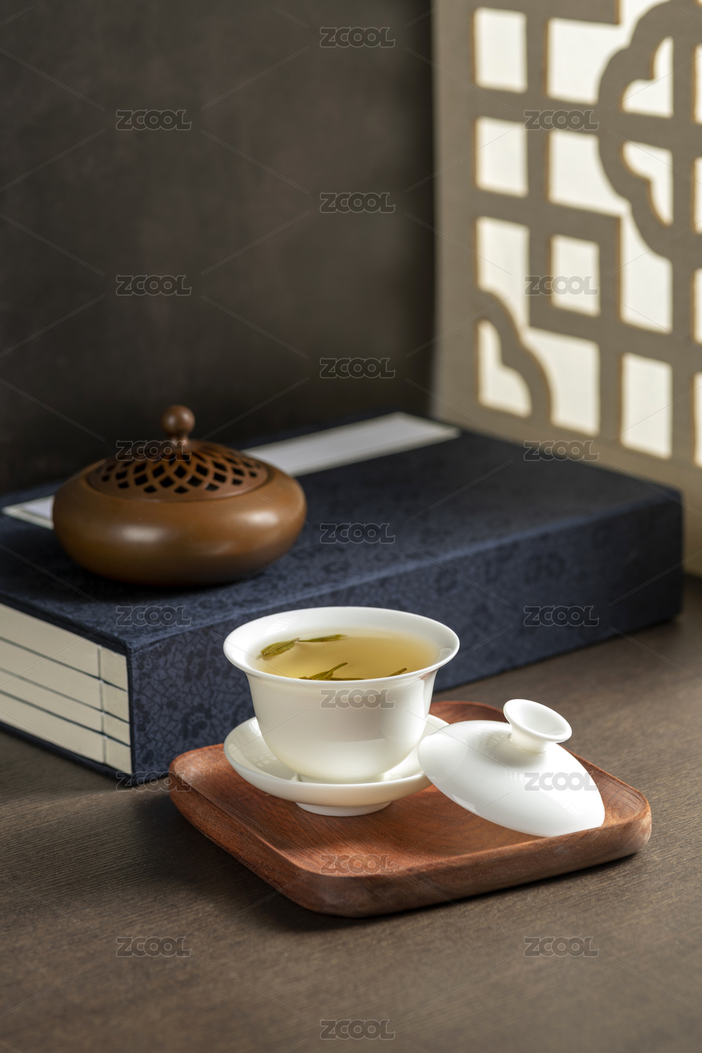 一杯蓋碗茶與紫銅香爐擺放在木托盤中