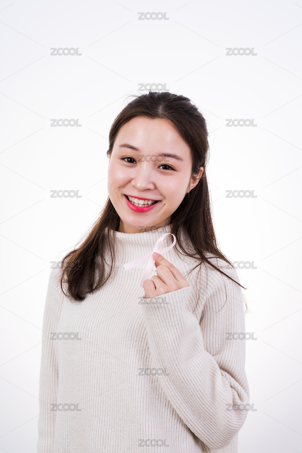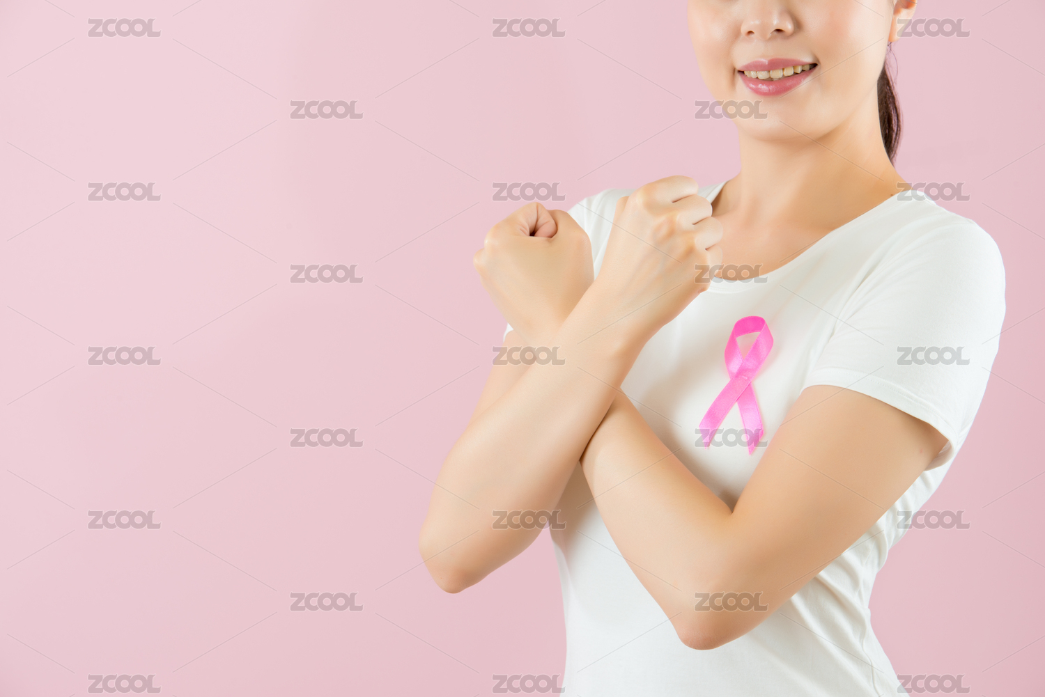 年輕和健康的亞洲女孩穿上粉紅色結(jié)上顯示被隔絕在粉紅色的背景防癌乳腺癌宣傳胸部。醫(yī)療和健康理念。