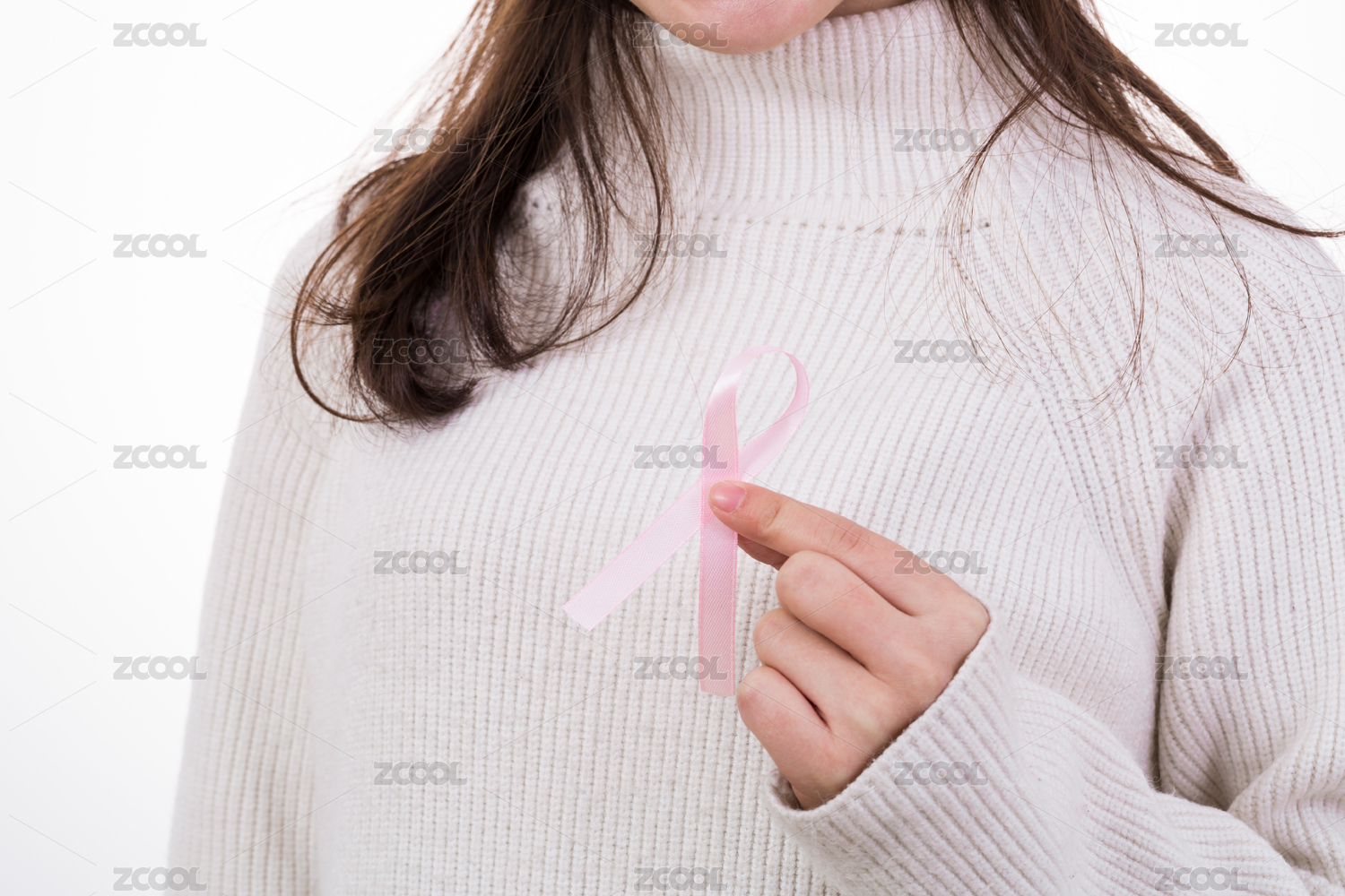 乳腺健康的概念。漂亮的年輕女性拿著粉紅色的預(yù)防乳腺癌絲帶
