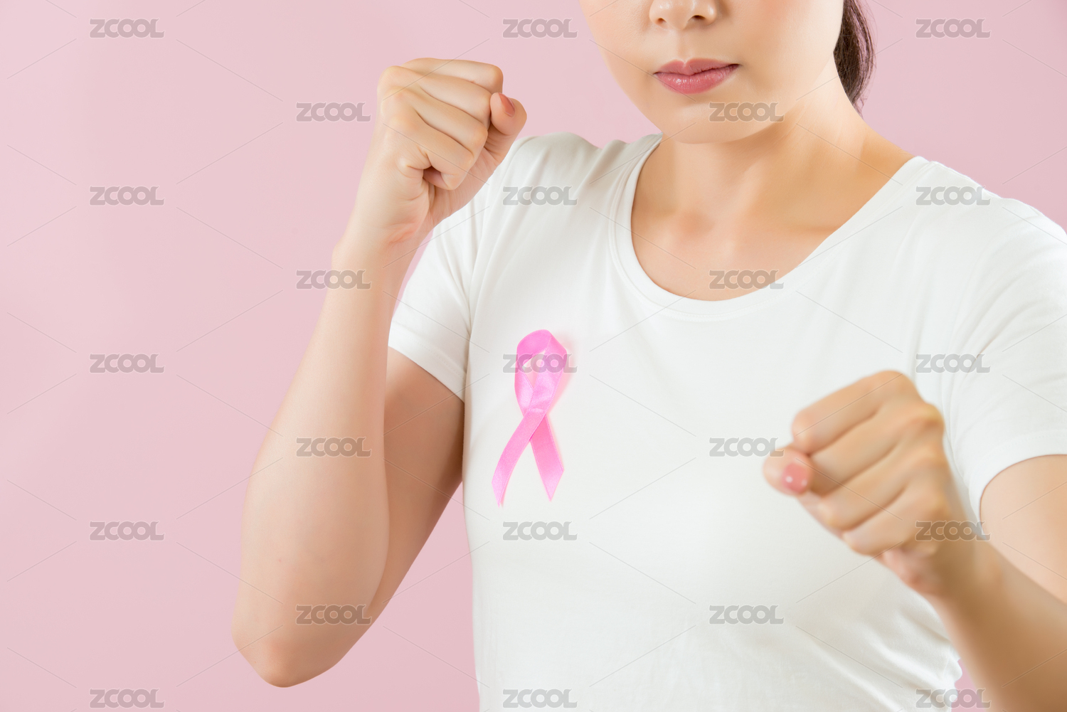 混血亞洲中國模式雙拳她的手掌和手臂交叉在胸前,對(duì)女性癌癥隔絕在粉紅色的背景。醫(yī)療和健康理念。