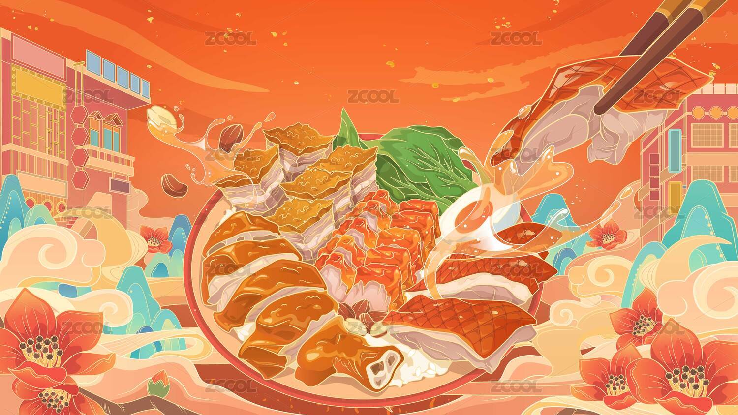 中國風(fēng)廣式燒臘餐飲美食矢量插畫海報