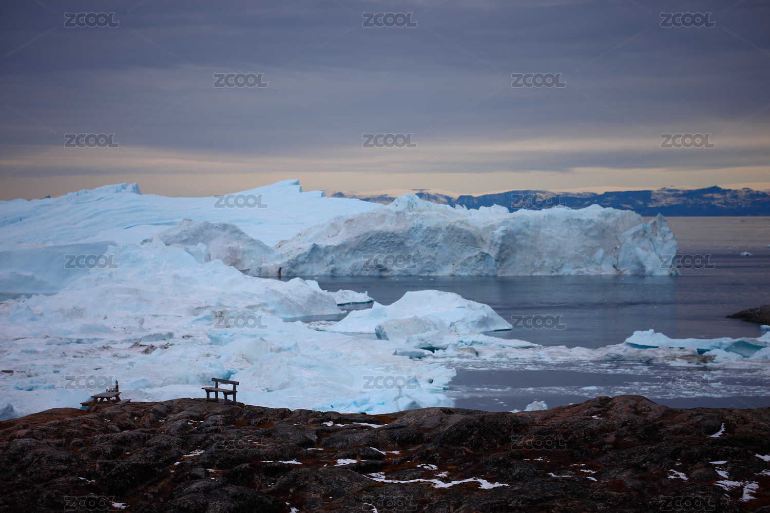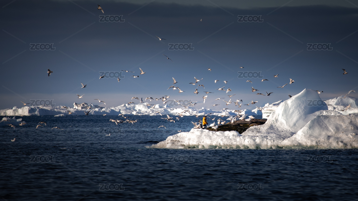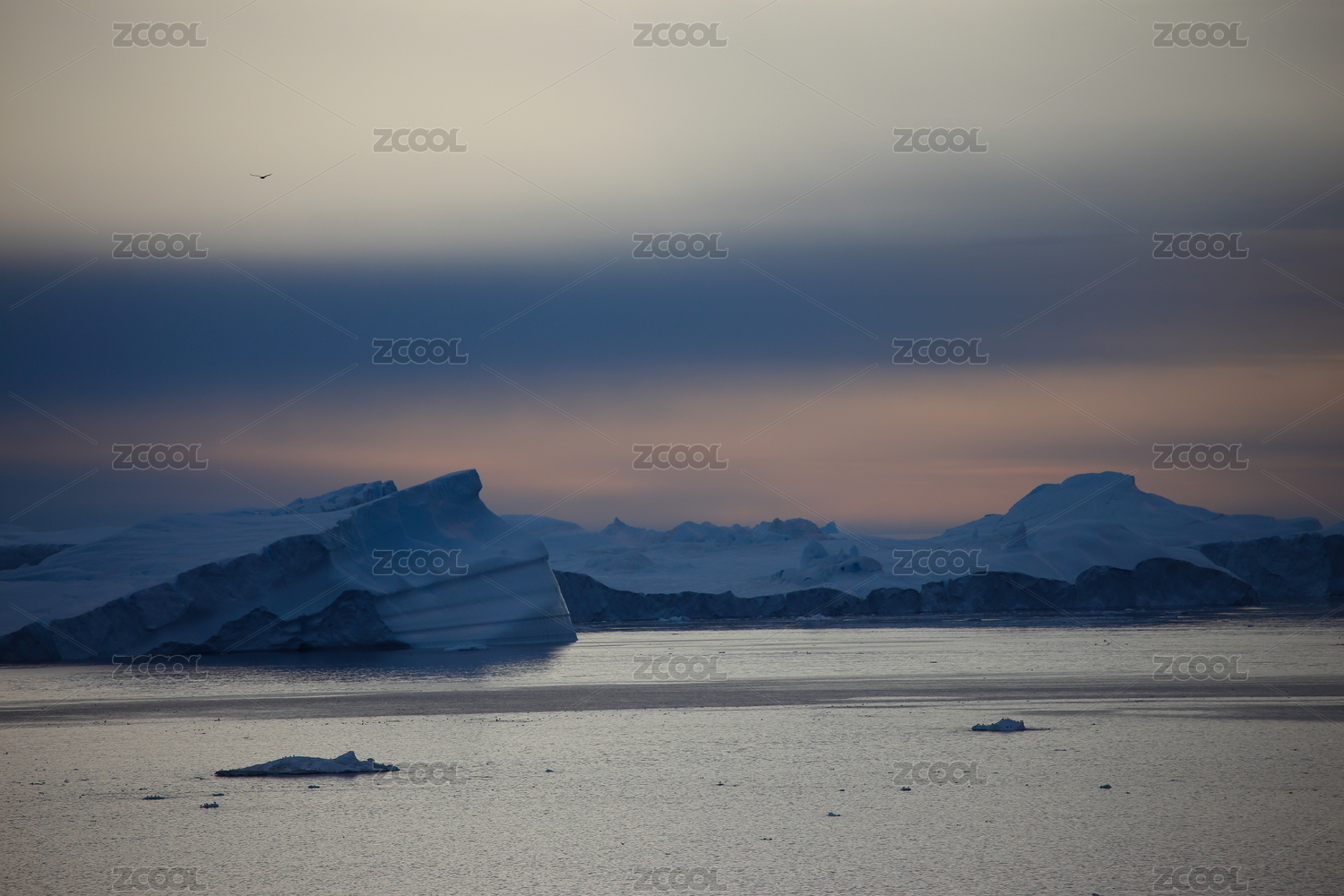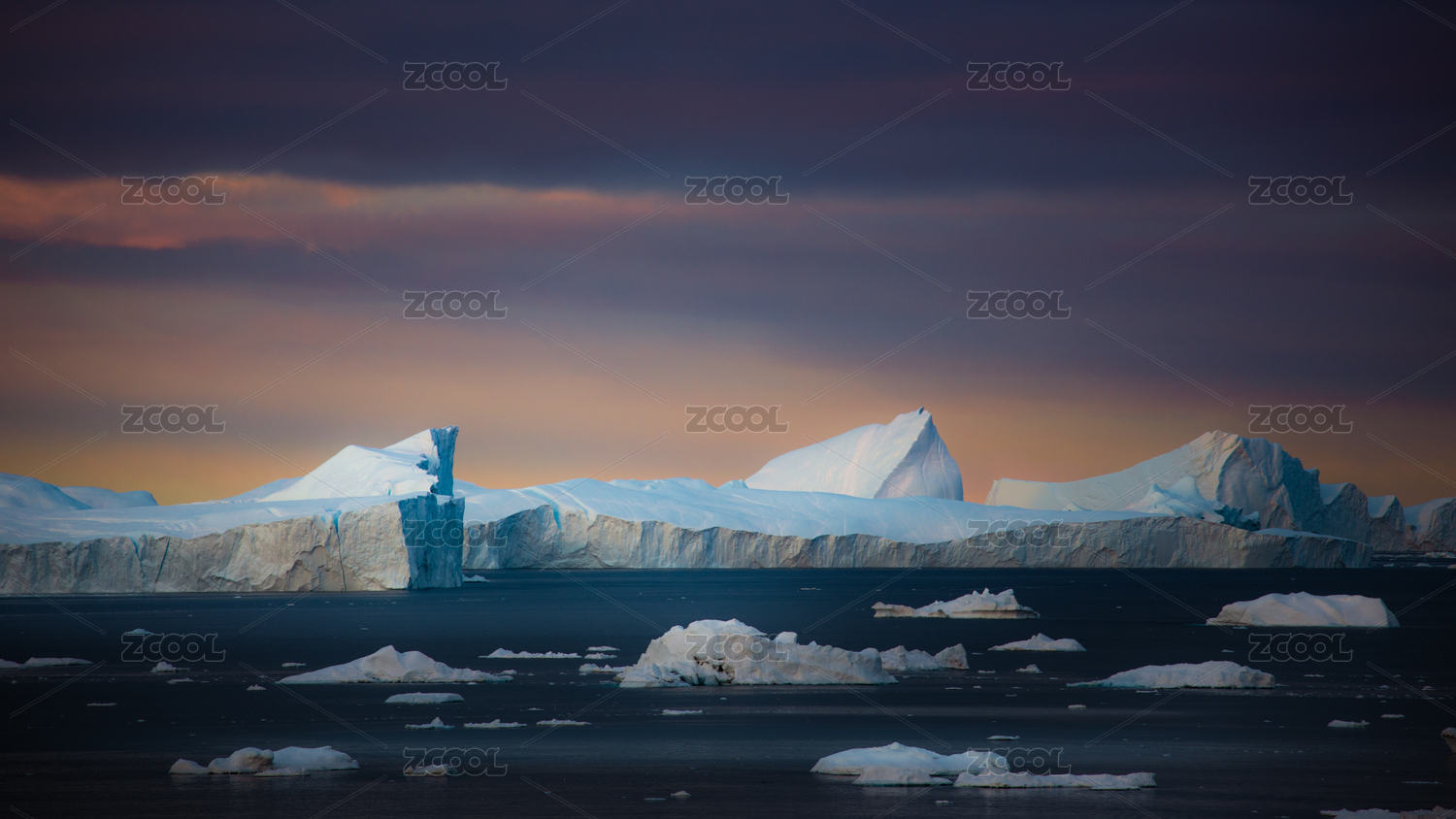 北極,丹麥格陵蘭的巨大冰山浮冰海鳥和晨曦