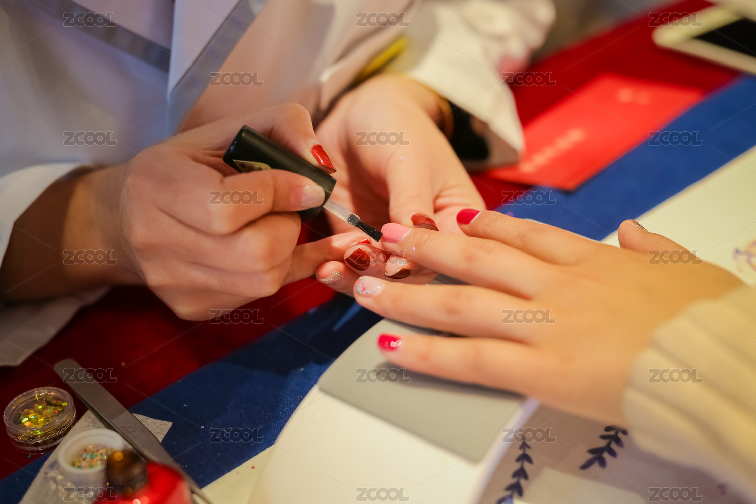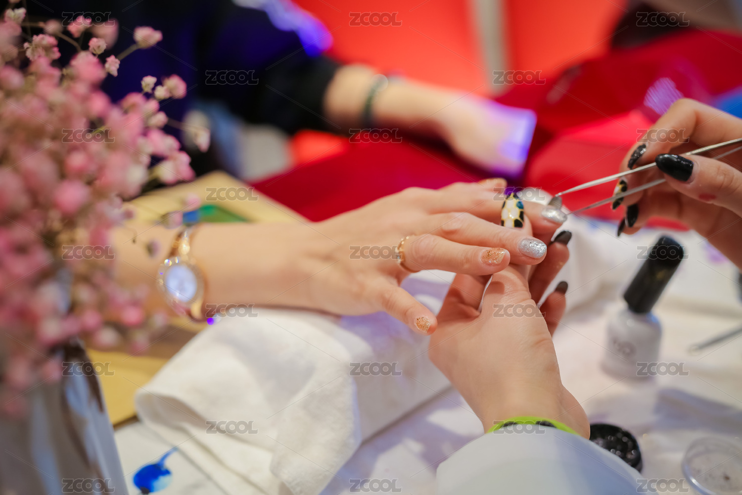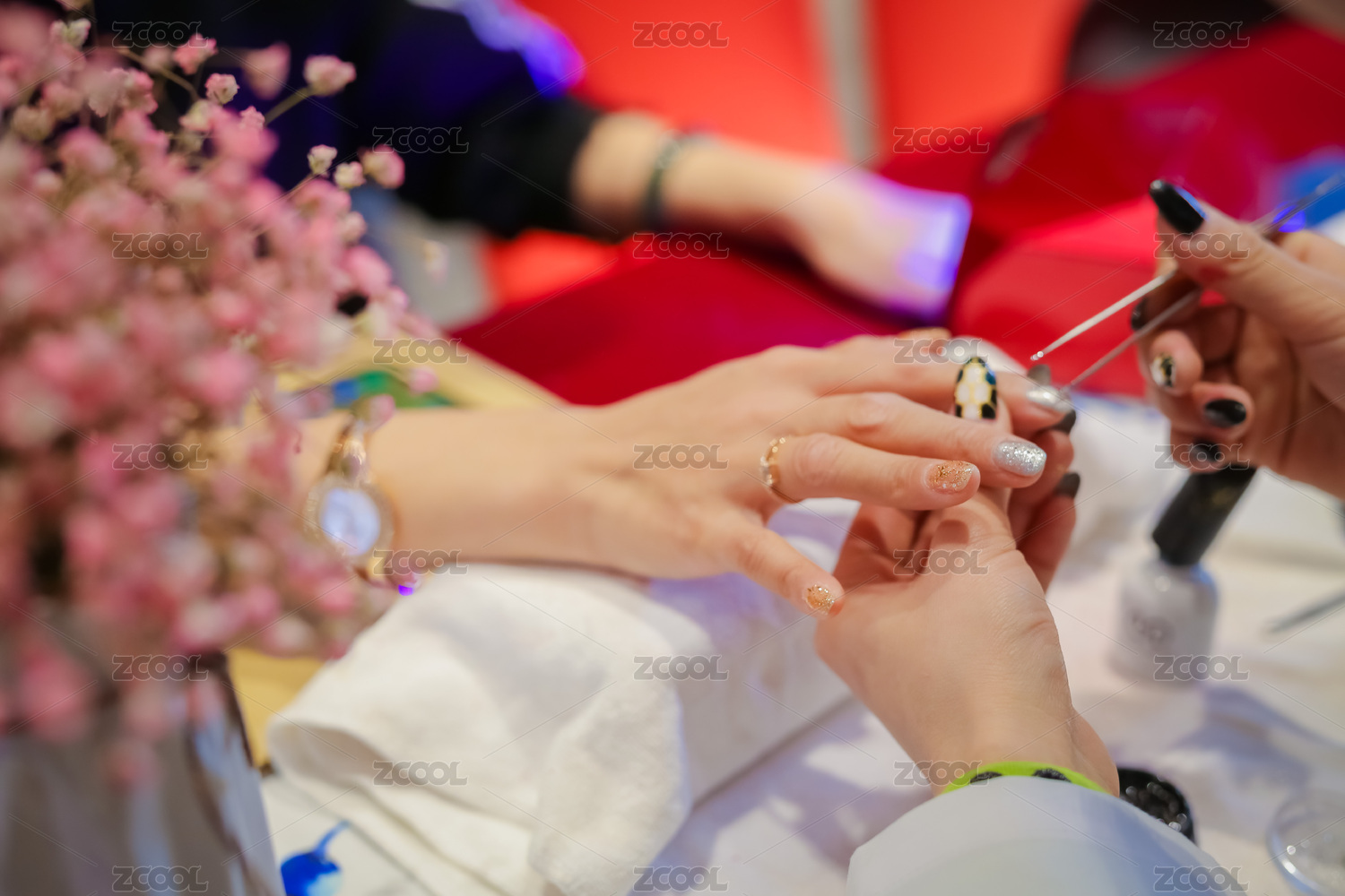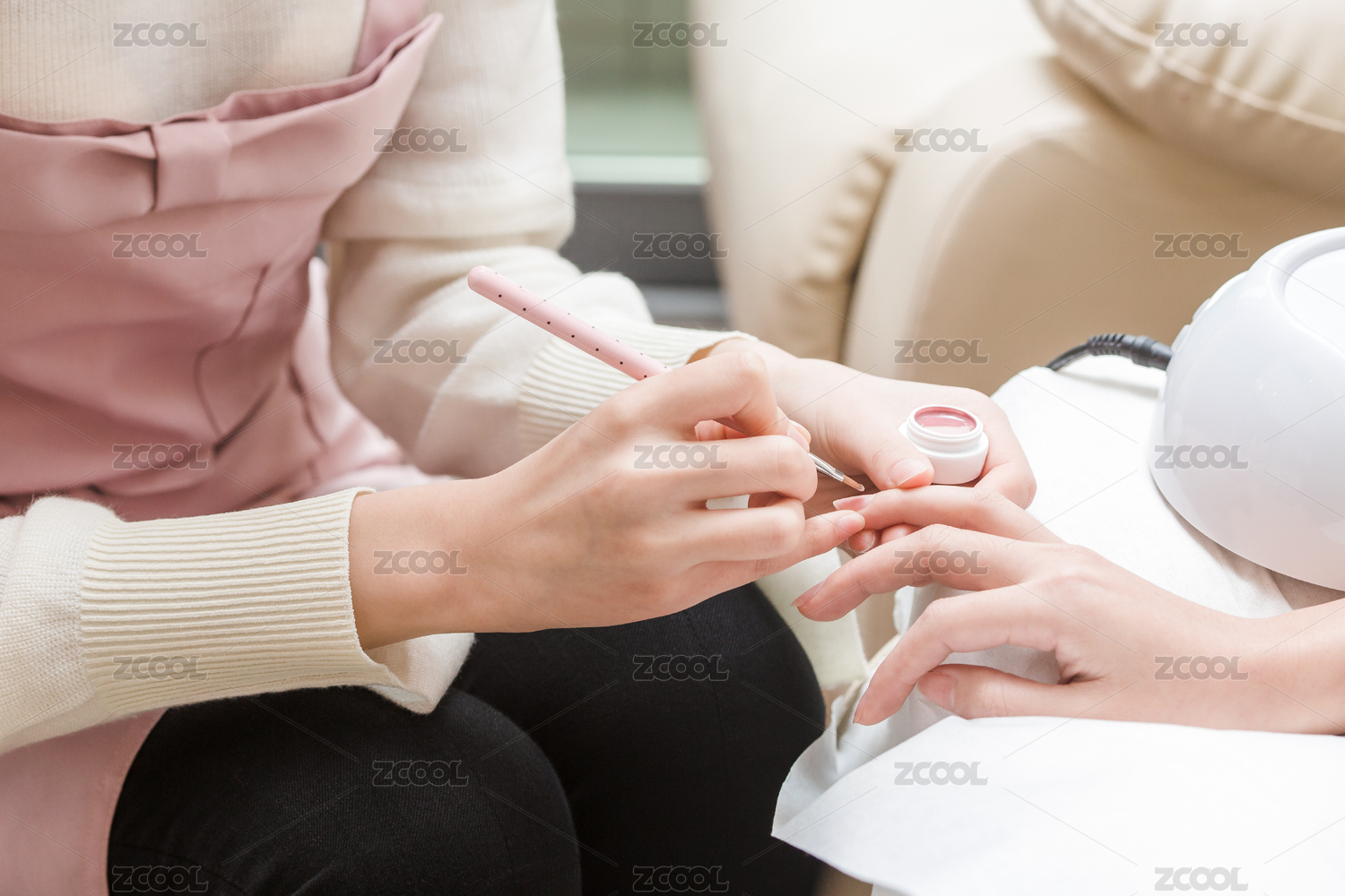 亞洲美甲持有美容院客戶的手放在桌面上使用指甲油,衛(wèi)生巾,面霜和照明工具美甲。美麗和時(shí)尚理念。