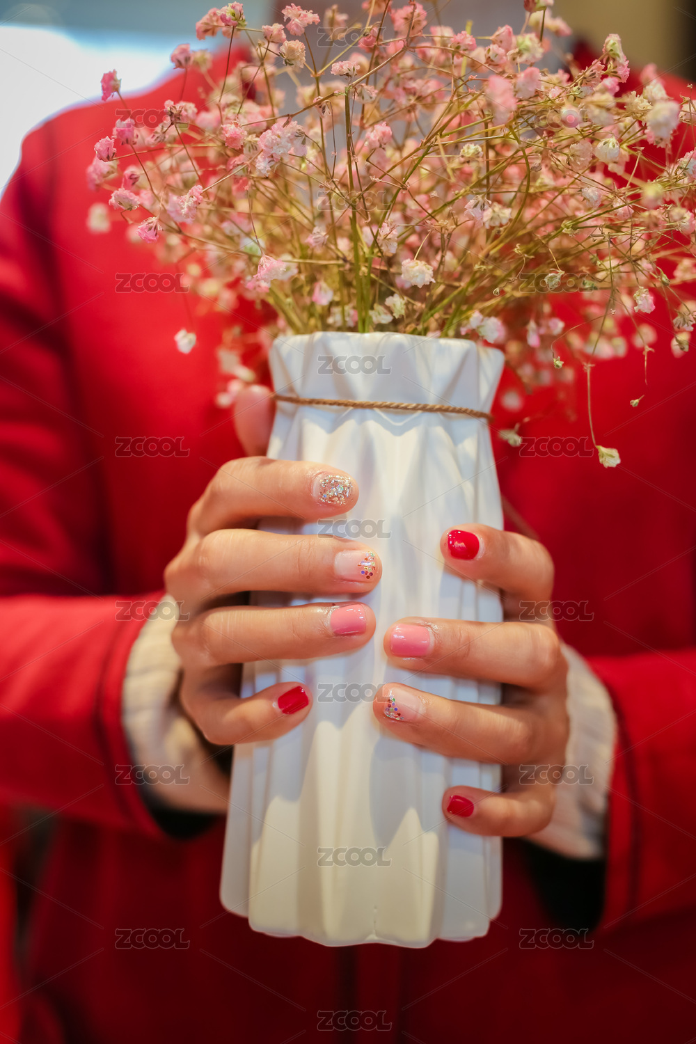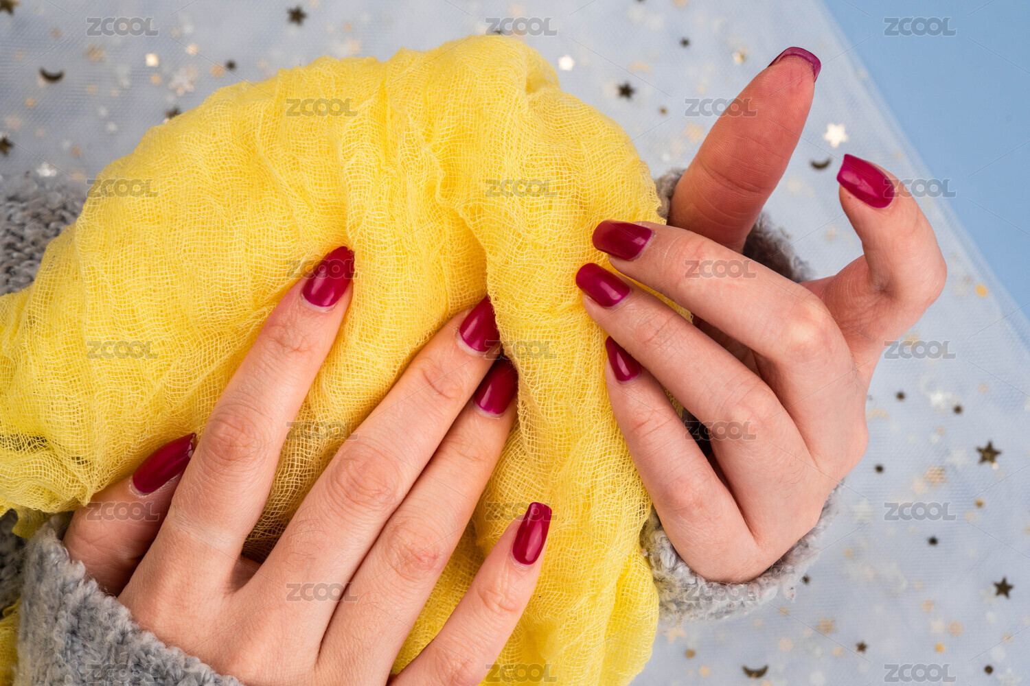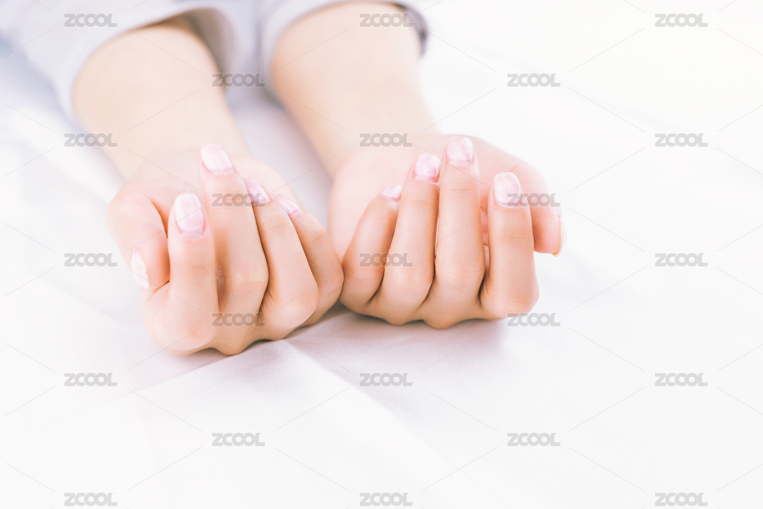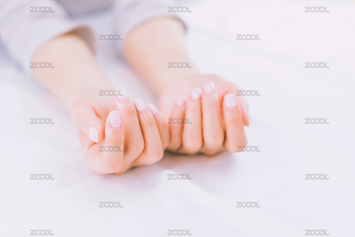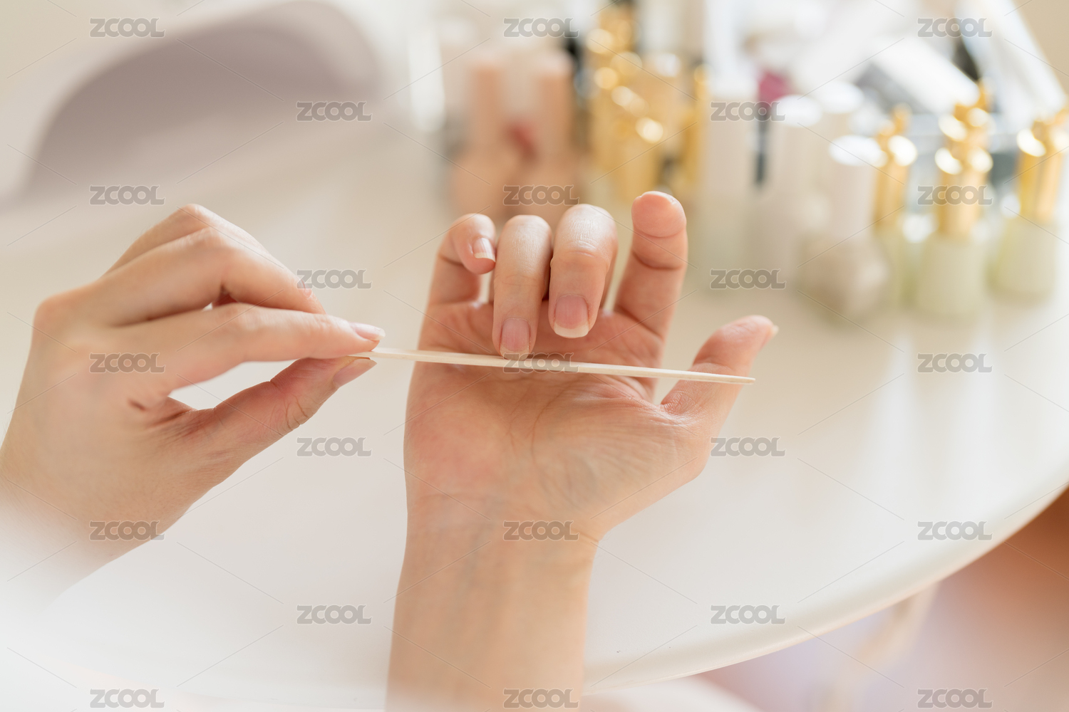 亞洲美甲持有美容院客戶的手放在桌面上使用指甲油,衛(wèi)生巾,面霜和照明工具美甲。美麗和時(shí)尚理念。