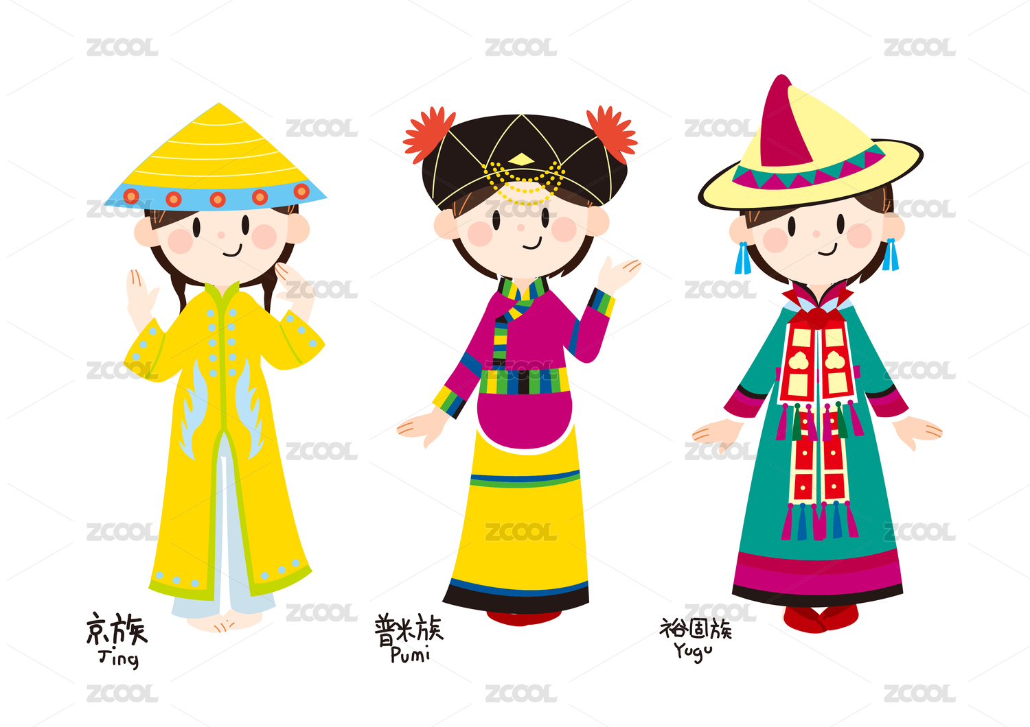 矢量可愛少數(shù)民族裝扮京族裕固族普米族