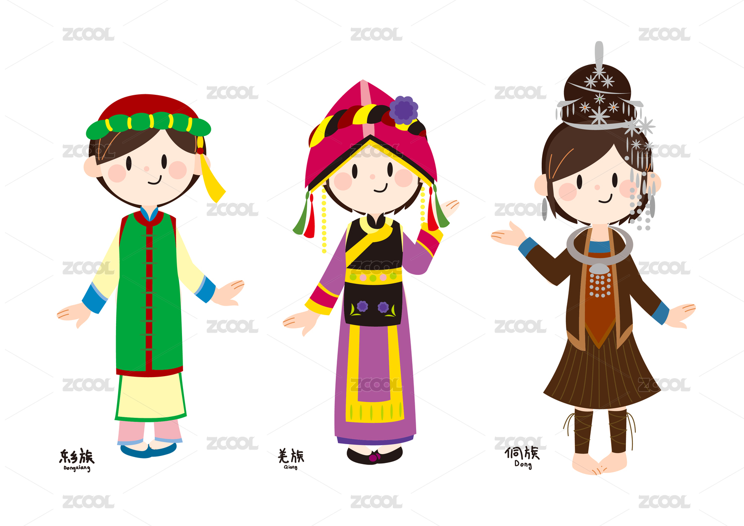 矢量可愛少數(shù)民族裝扮東鄉(xiāng)族羌族侗族