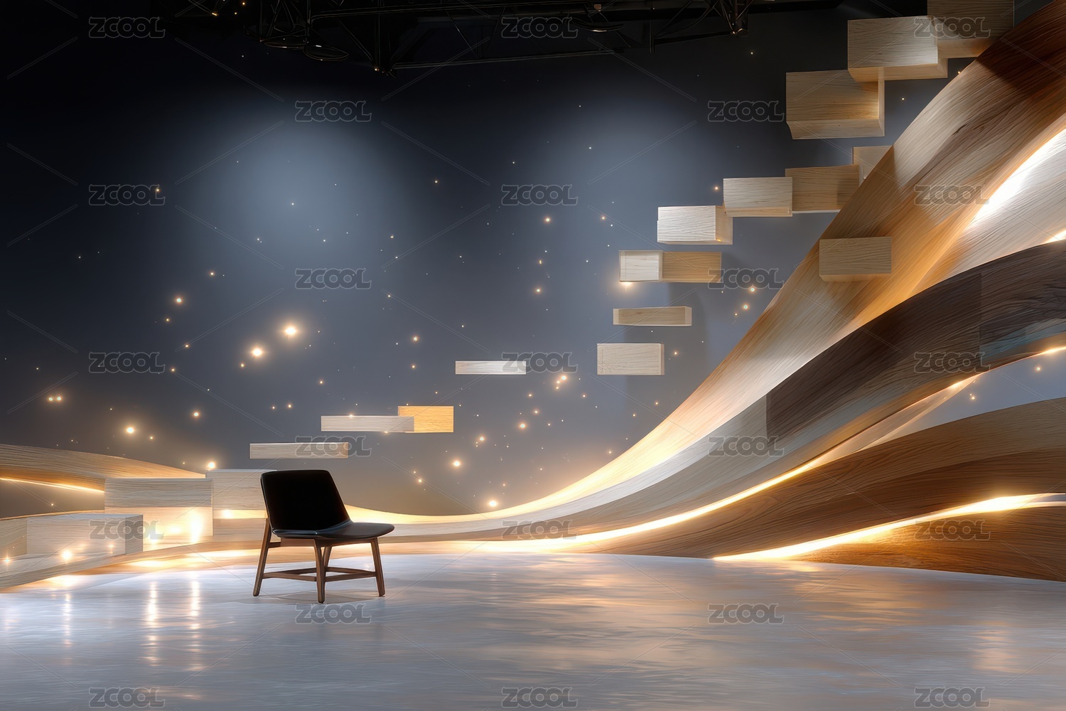 未來(lái)光影中的懸浮階梯與座椅