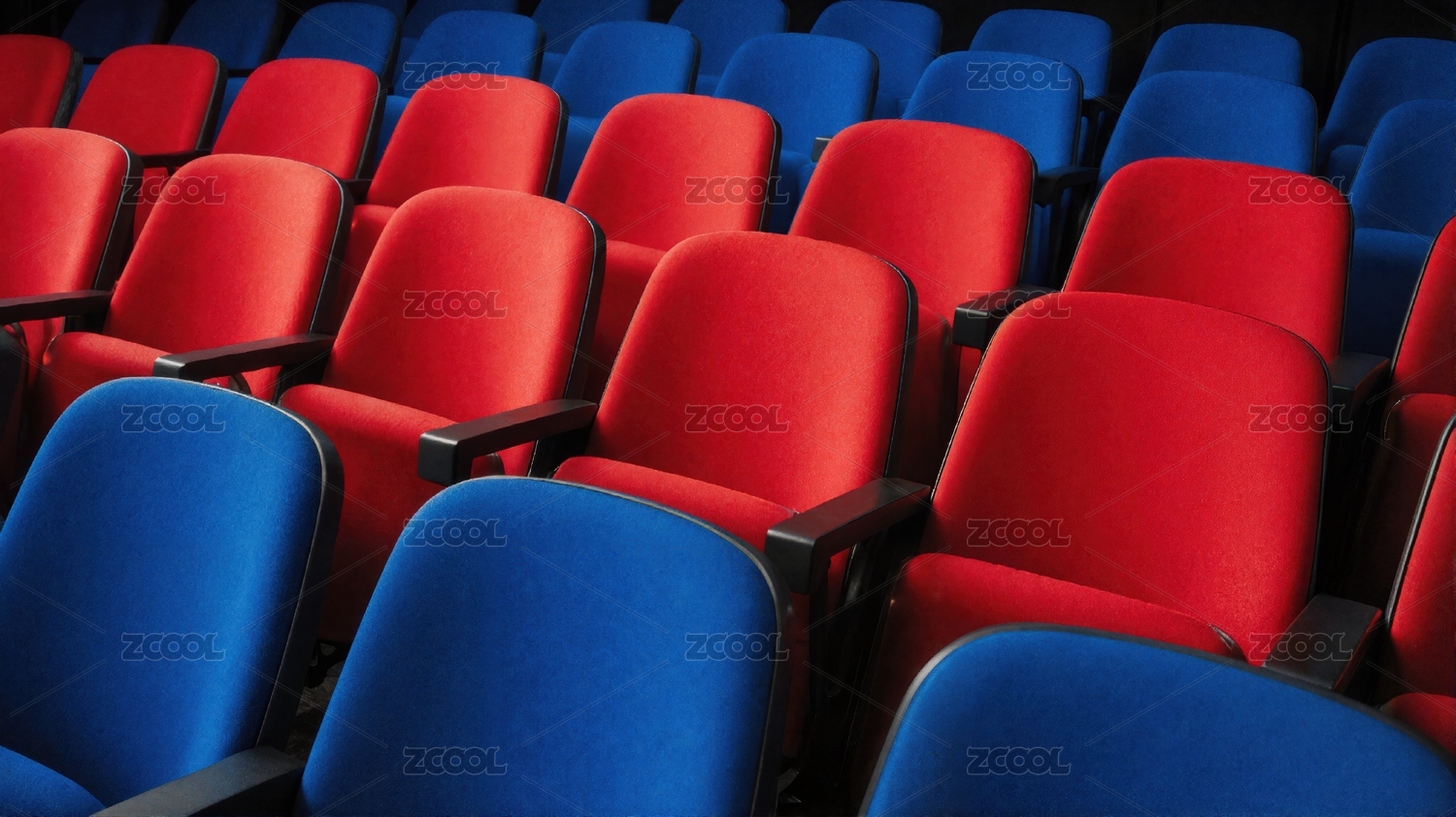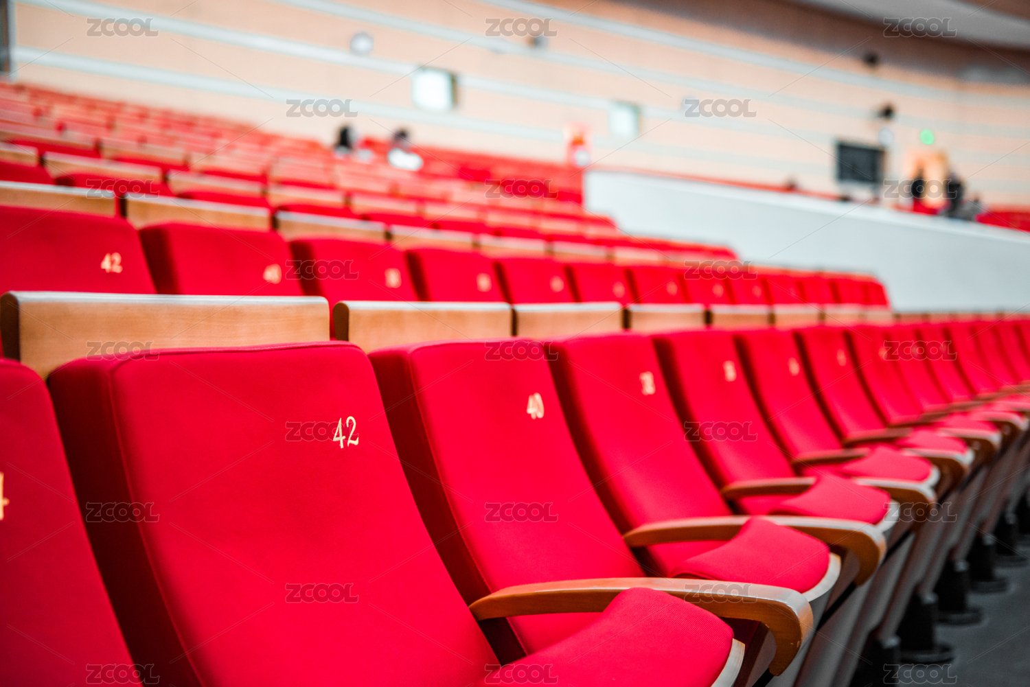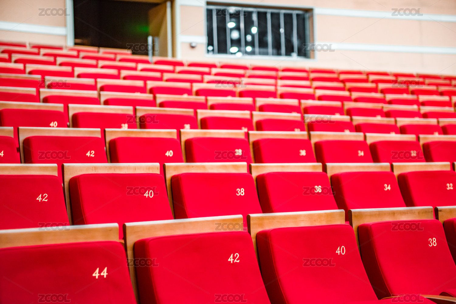 電影院演出廳內(nèi)很多排紅色的無(wú)人座椅
