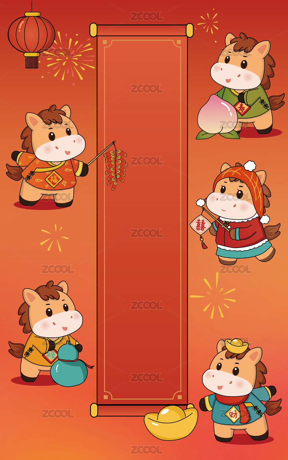 馬年卡通可愛小馬春節(jié)紅色素材