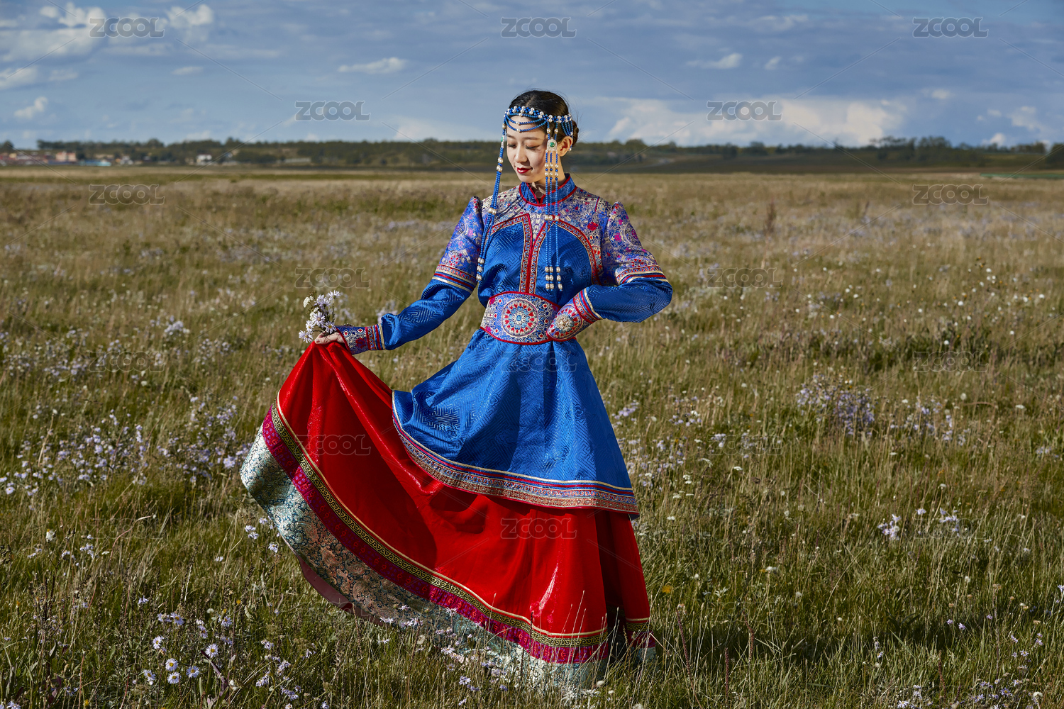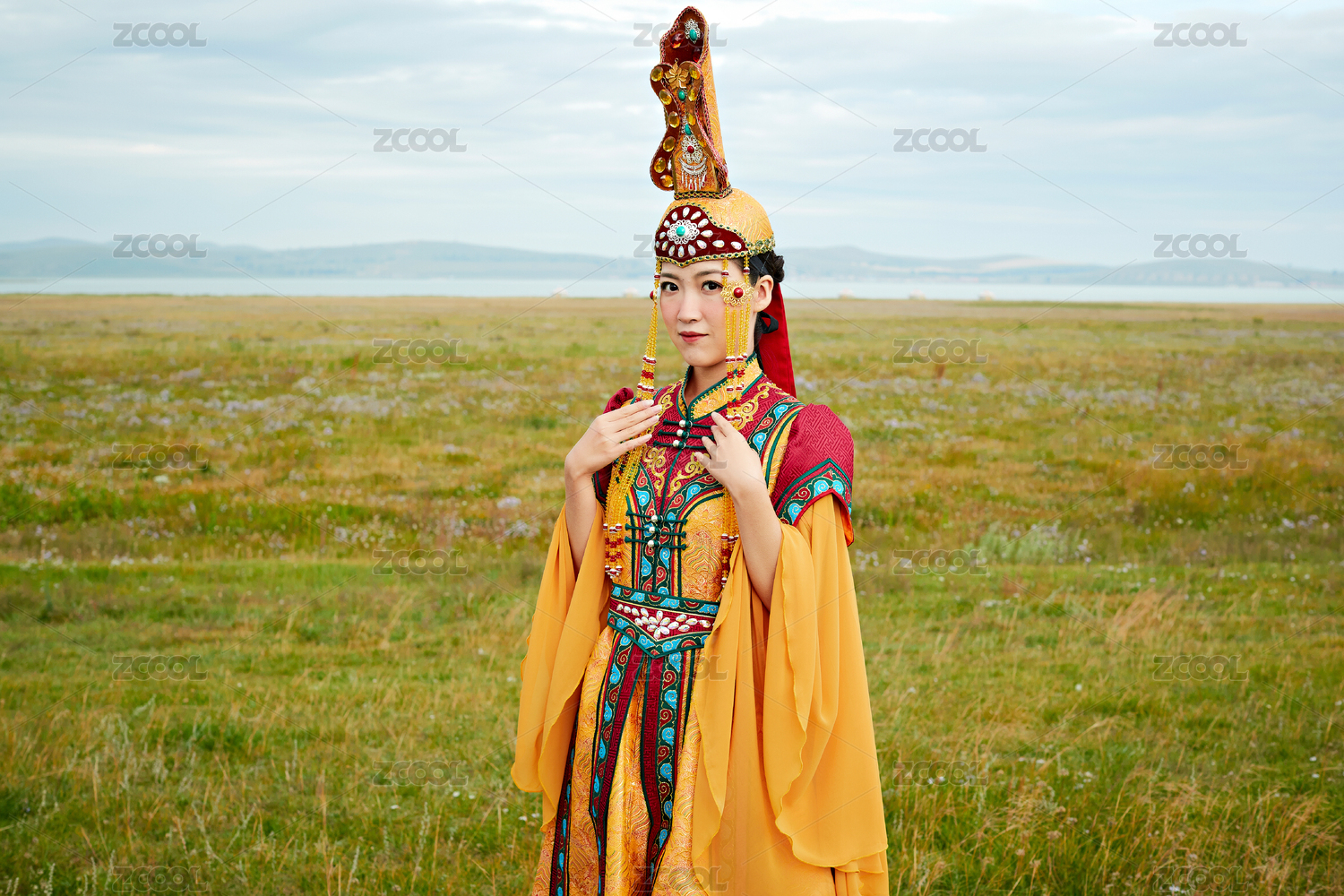 草原上穿著蒙古族傳統(tǒng)服飾的年輕少女