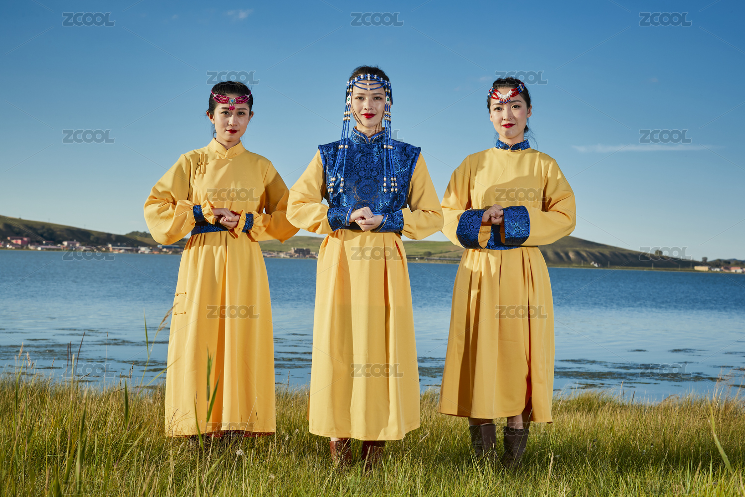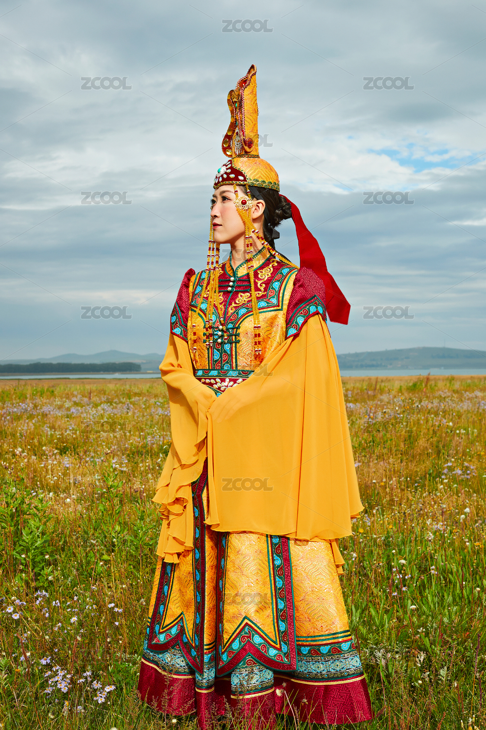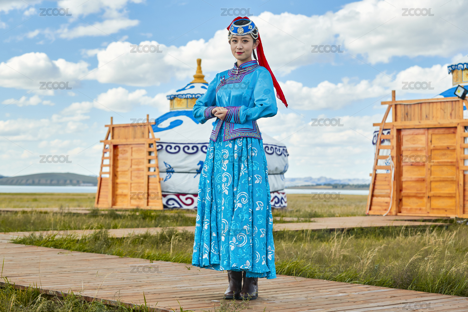 草原上蒙古包前身穿蒙古族美麗服飾的少女