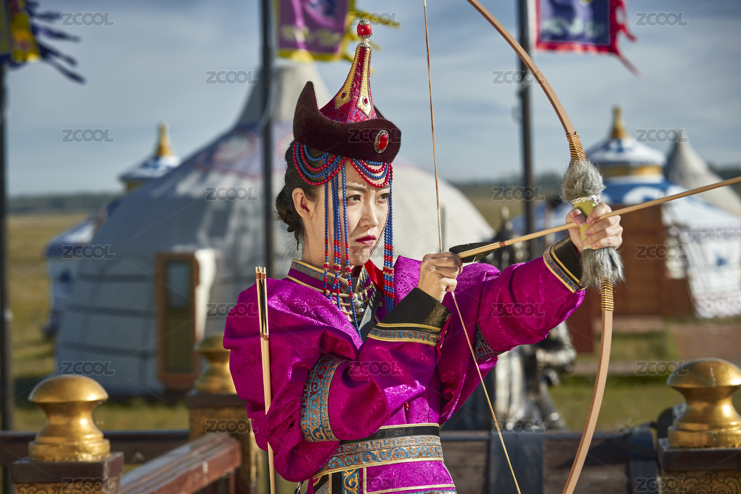 蒙古包前身穿蒙古族飾手持弓箭的蒙族少女