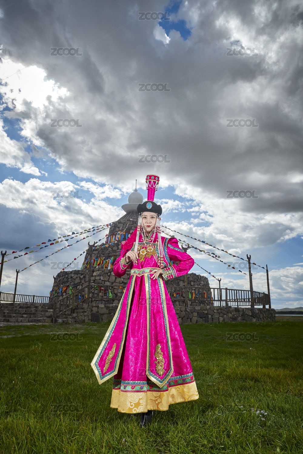 草原上敖包前身穿豪華蒙古族服飾的蒙族少女