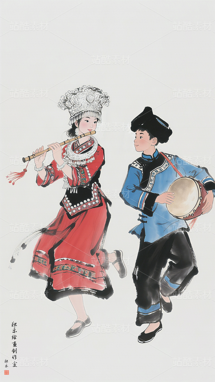 水墨人物裝飾畫少數(shù)民族服裝民族舞