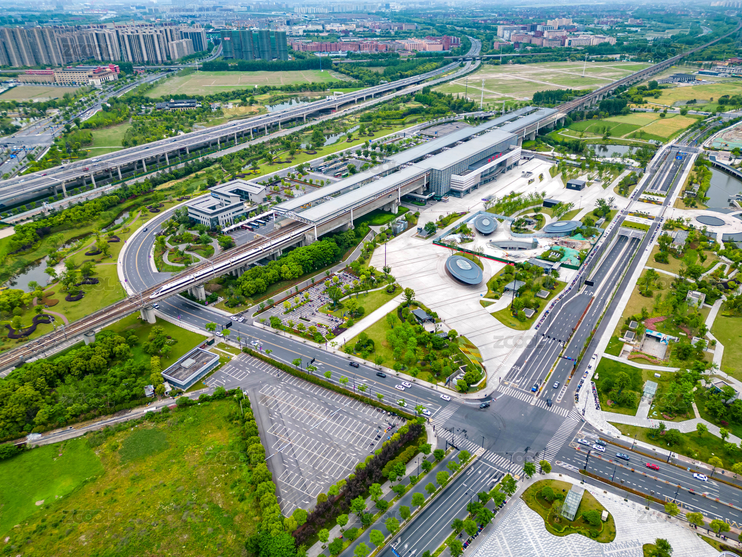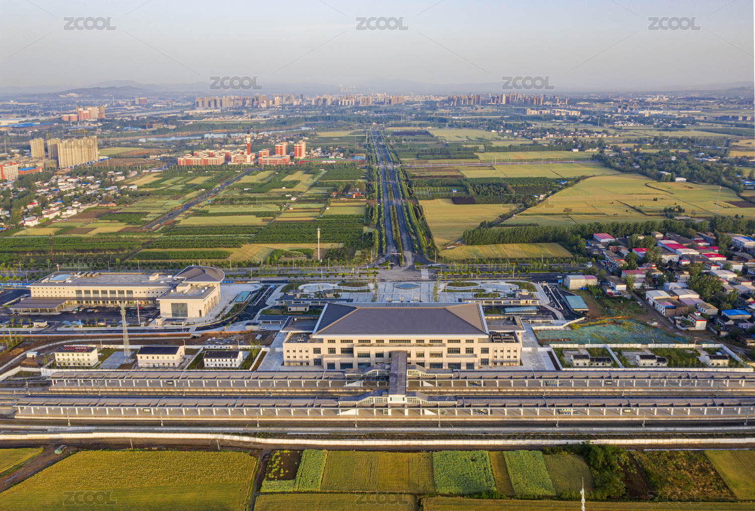 航拍視角下的小鎮(zhèn)高鐵站田園風(fēng)光