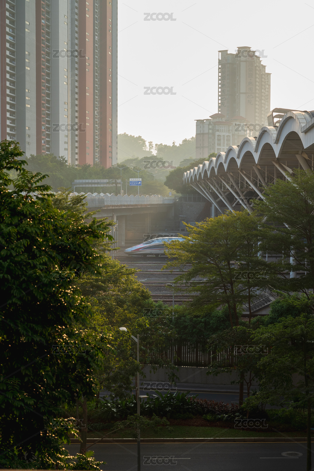 陽(yáng)光下繁忙的深圳北站高鐵站-正在發(fā)車(chē)的高