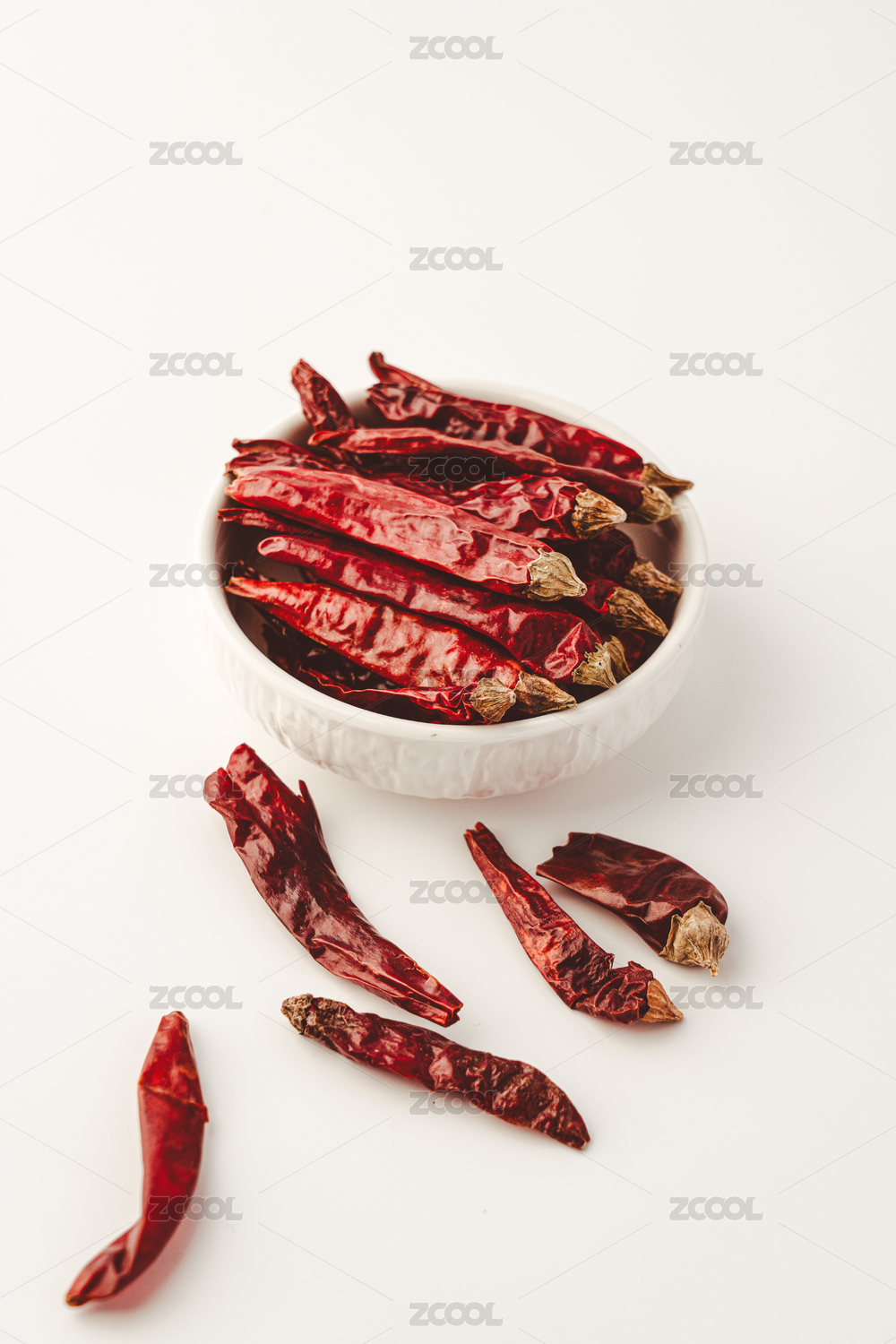 用白色碟子裝起來的紅干辣椒,散落的干辣椒
