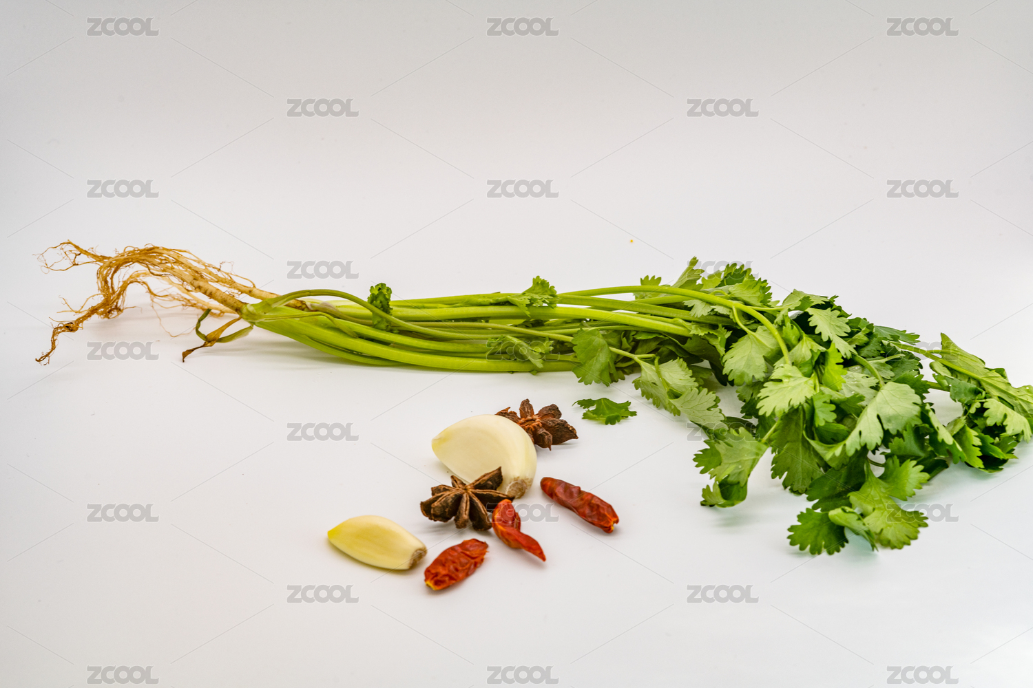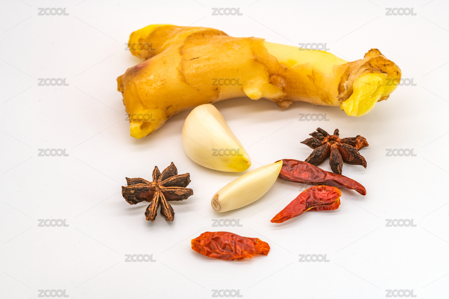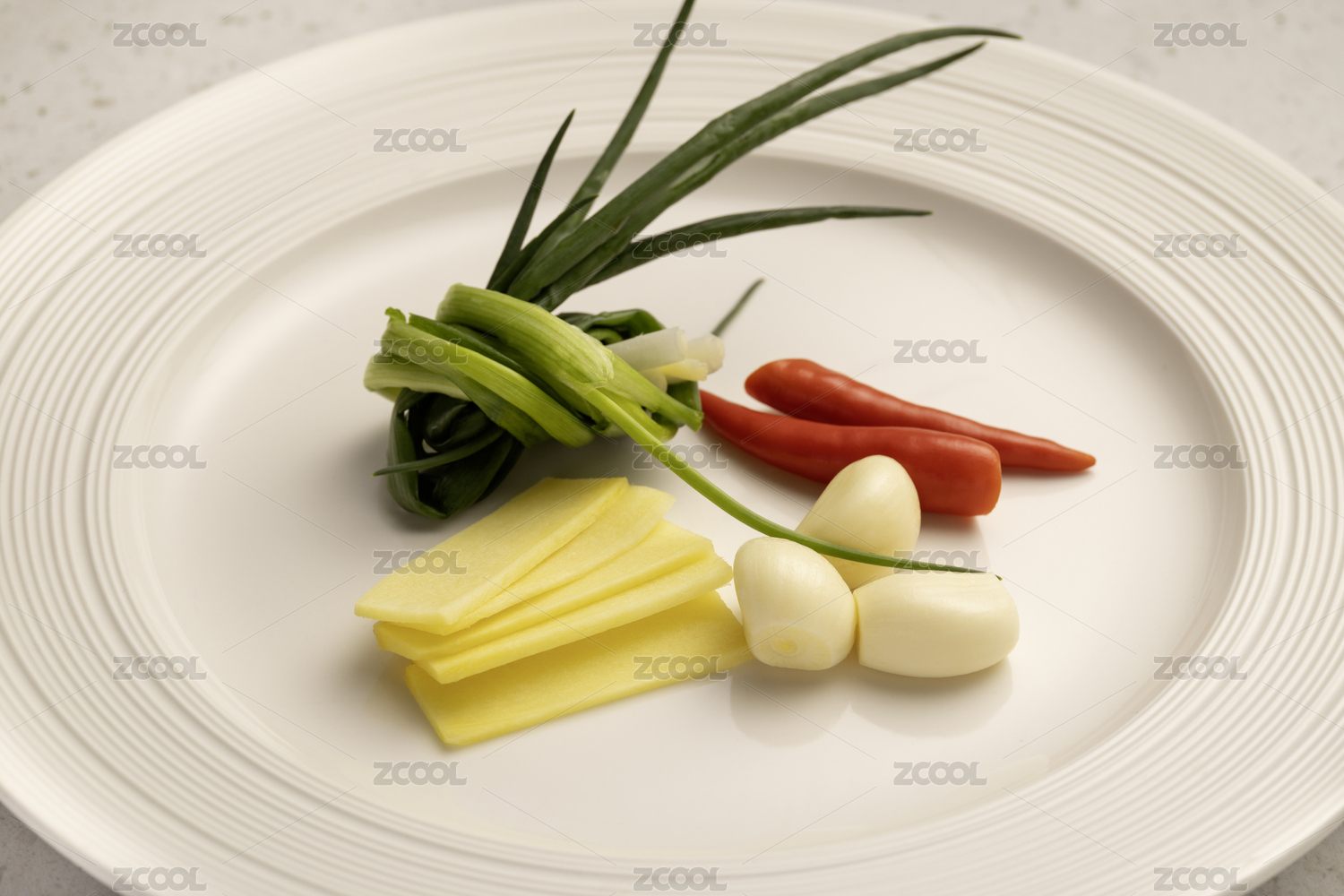 姜片大蒜小米辣小蔥白色盤子佐料烹飪食材