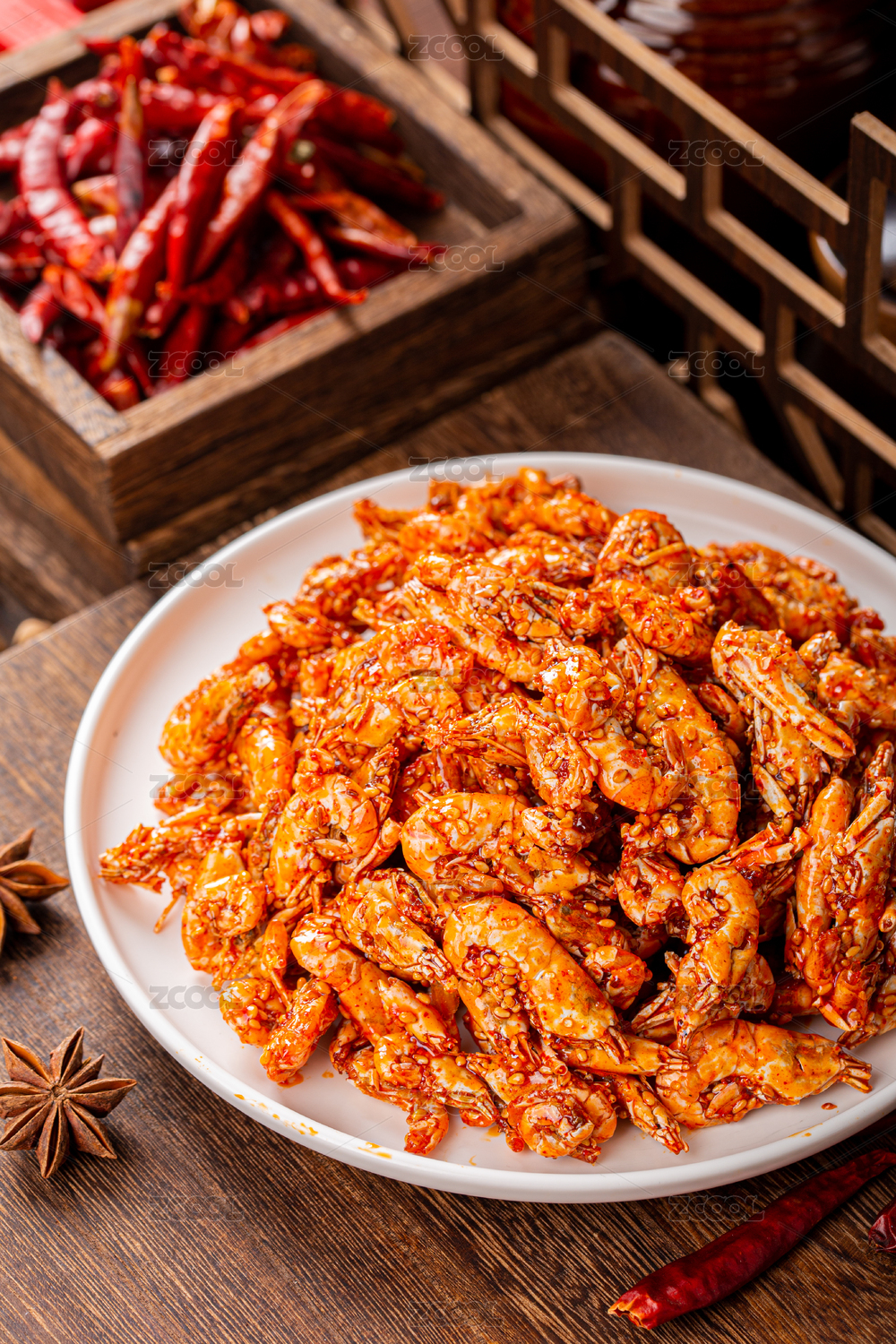 深色木板上擺放的香辣蝦