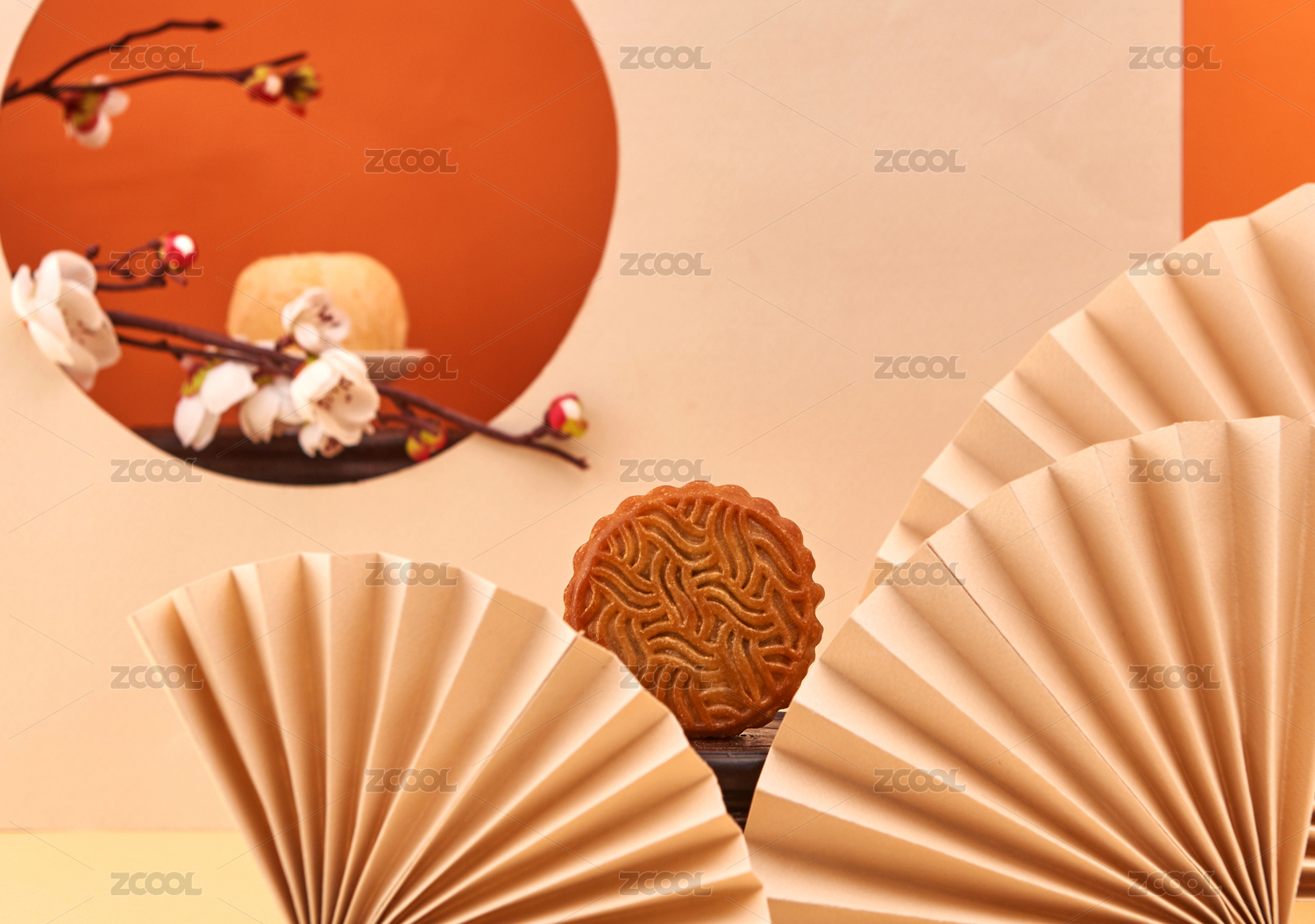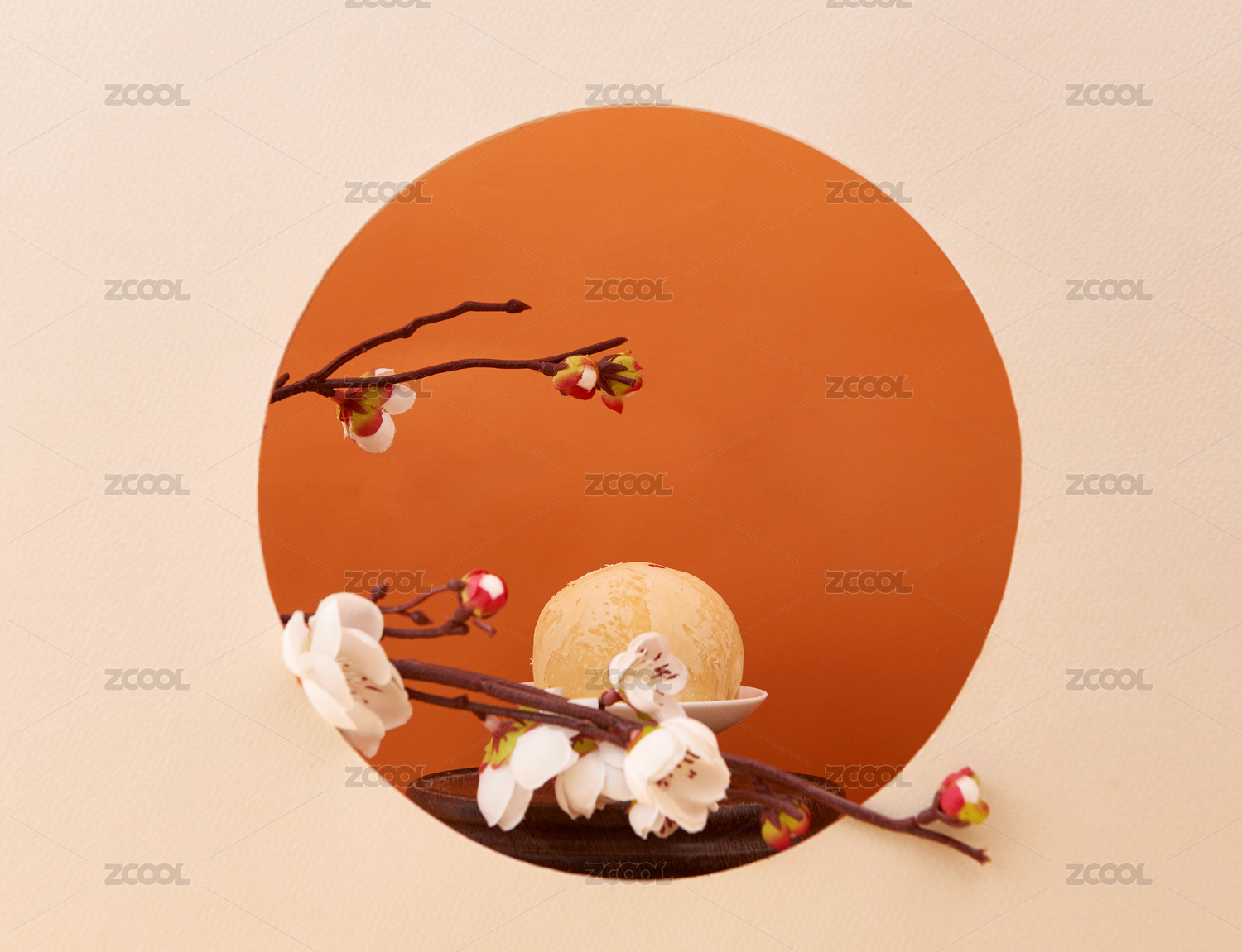 肉粉色背景下橘黃色鏤空圓窗內(nèi)的饃饃
