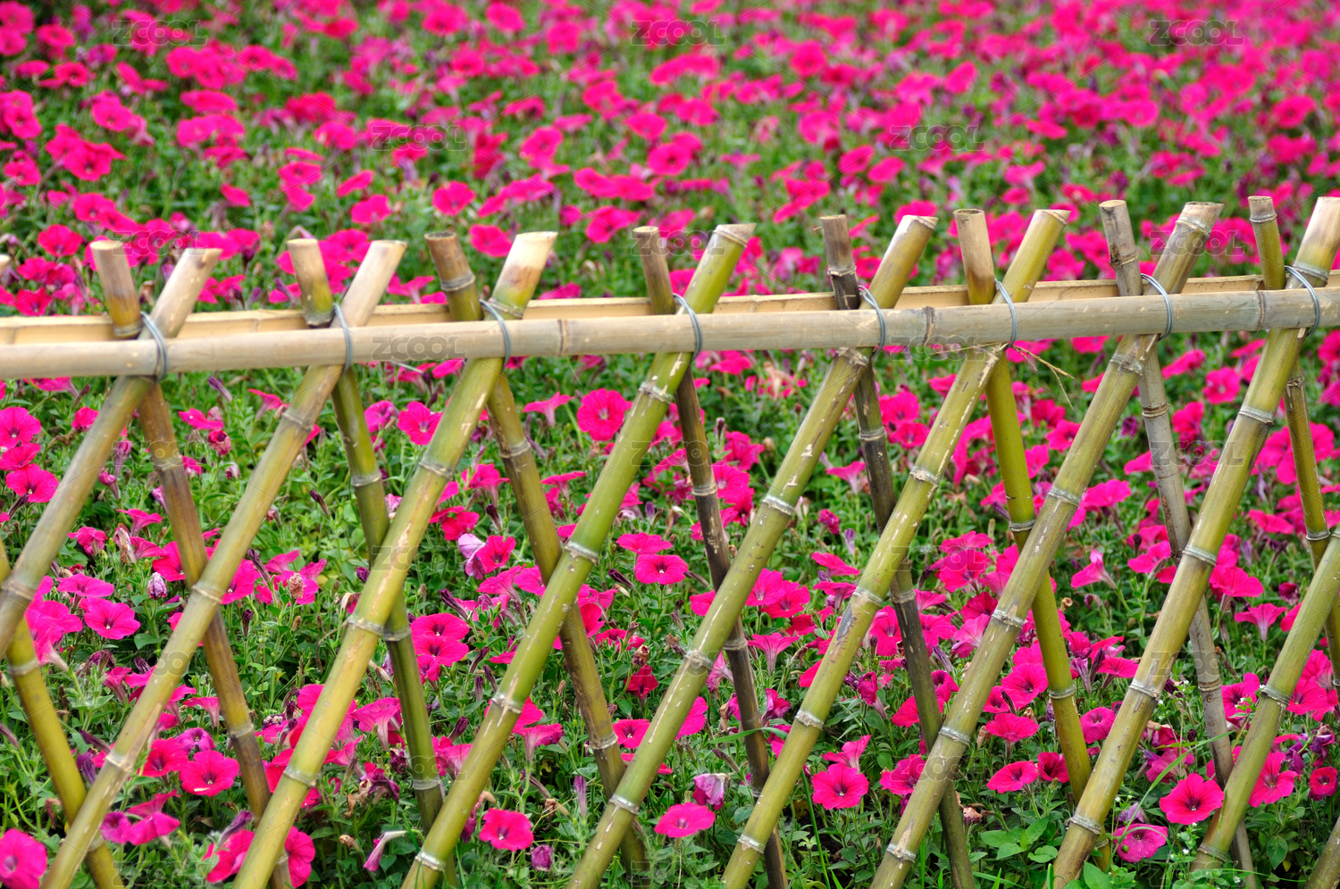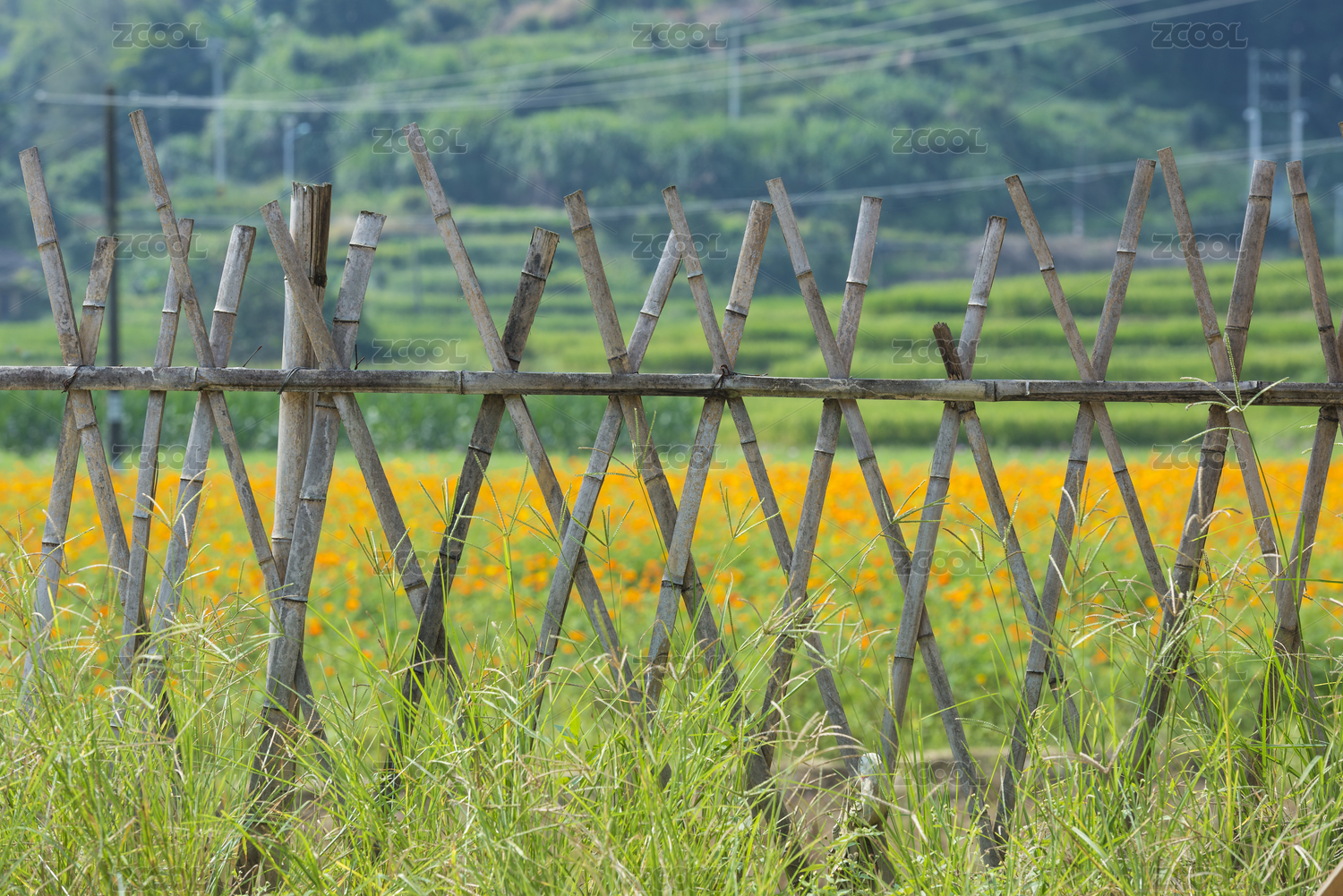 開花的百日草花田前一排籬笆,中國(guó)福建省太拔