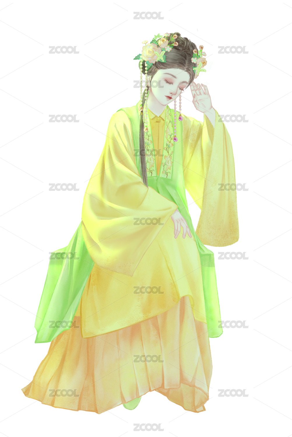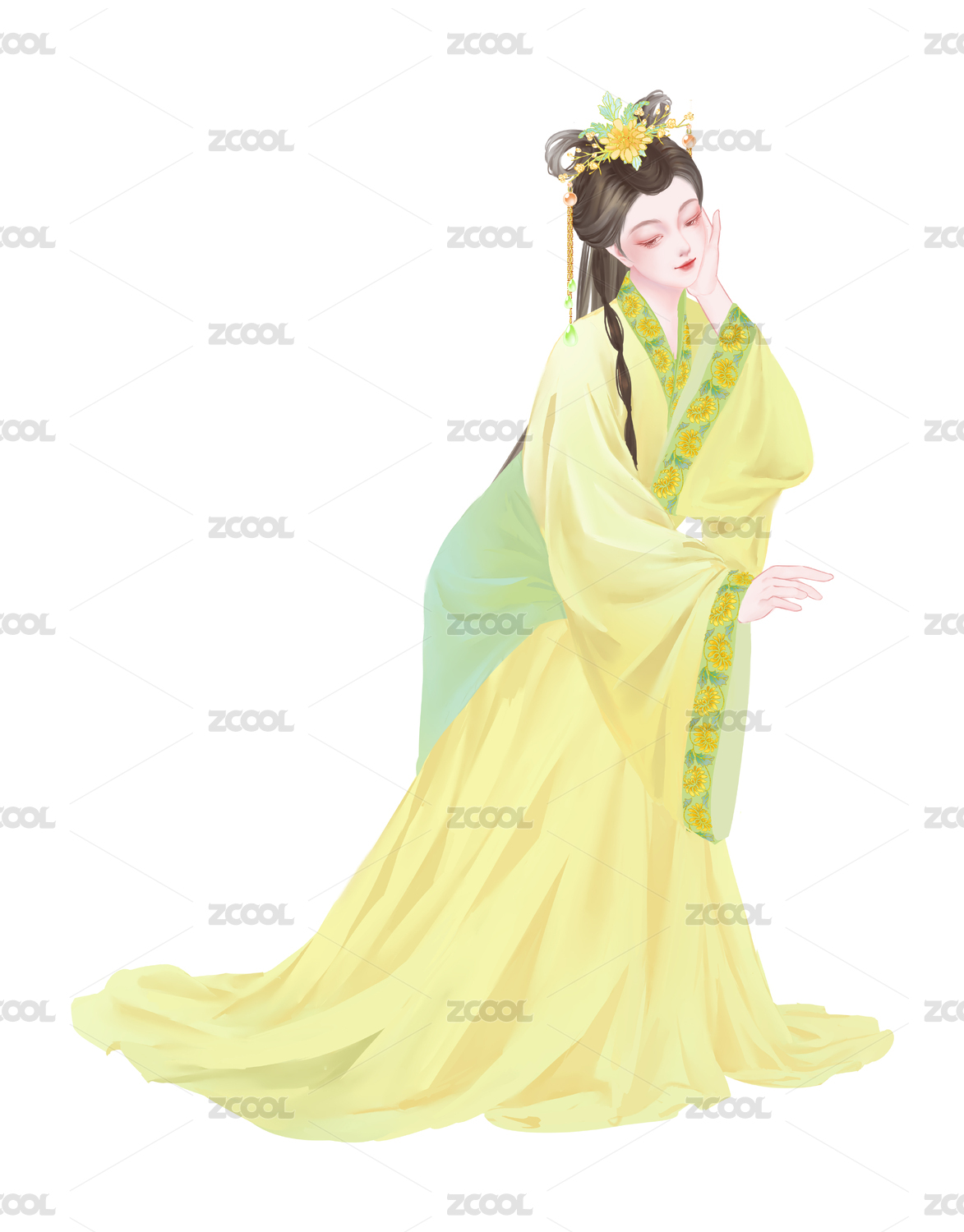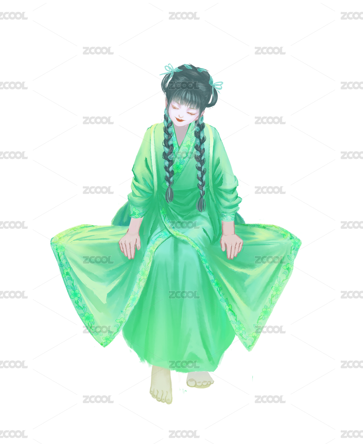 綠色雙馬尾古風(fēng)漢服古裝女人坐著低頭歪頭