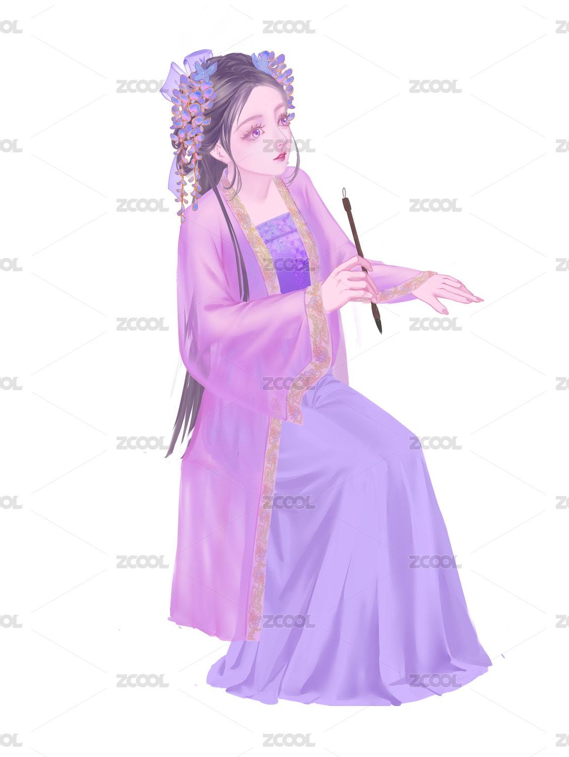 中式傳統(tǒng)古風(fēng)漢服古裝女人坐著拿毛筆寫(xiě)字