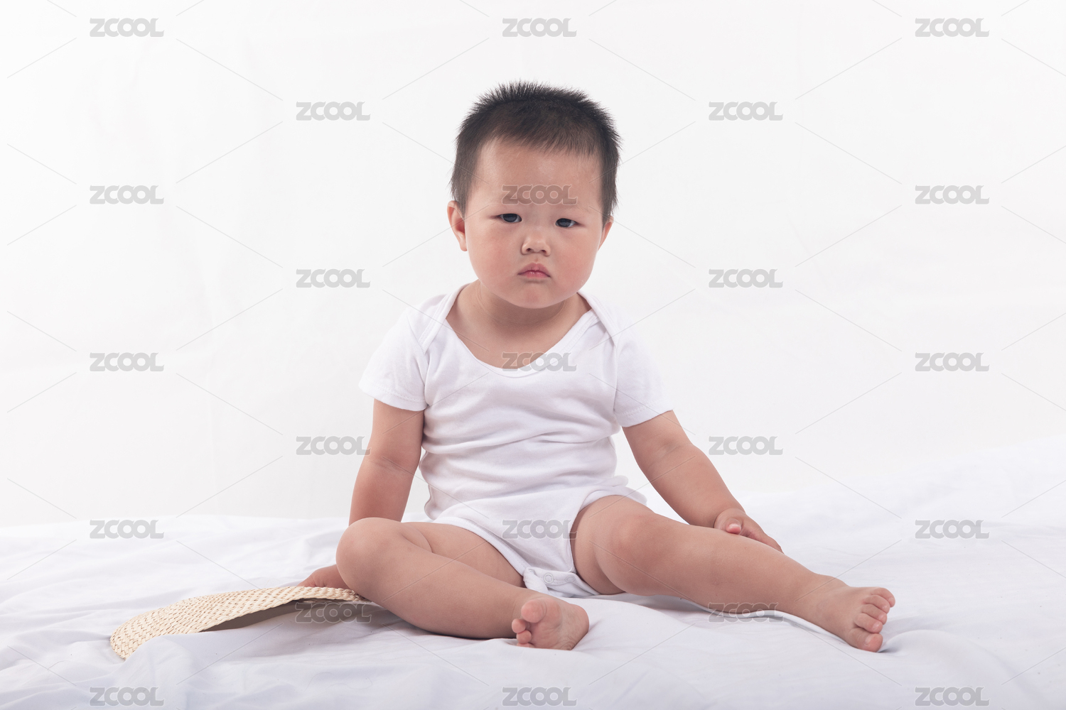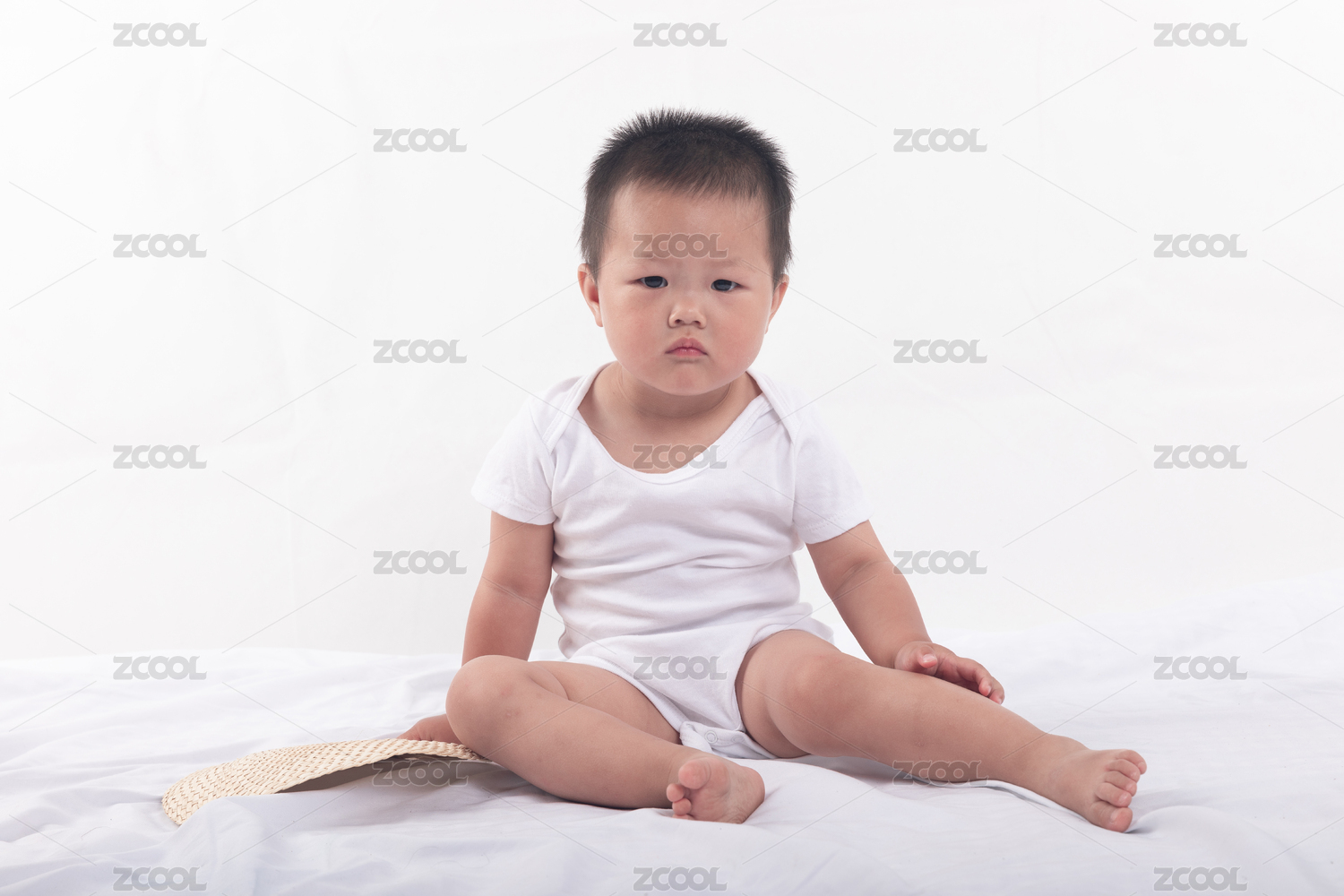 穿著白色連體衣坐著的小寶寶