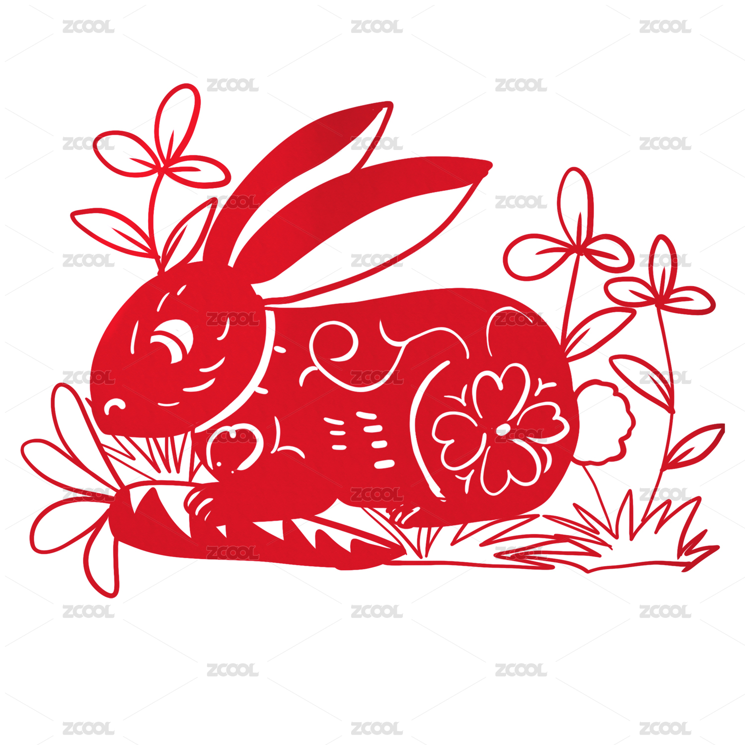 十二生肖兔白菜牡丹花梅花銅錢兔年彩色剪紙插畫