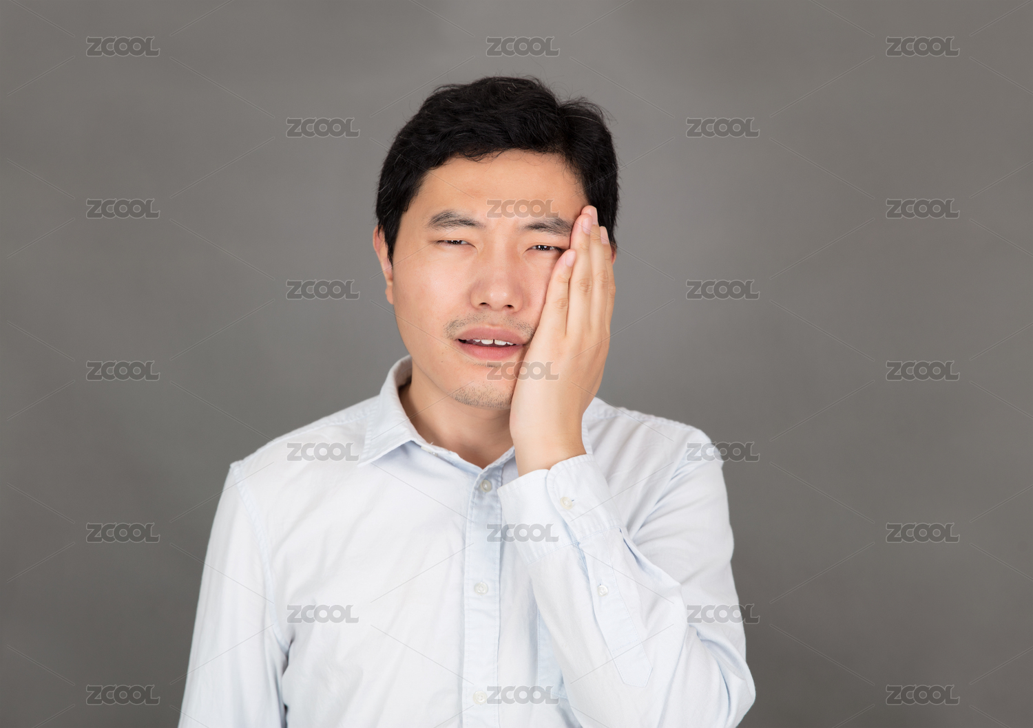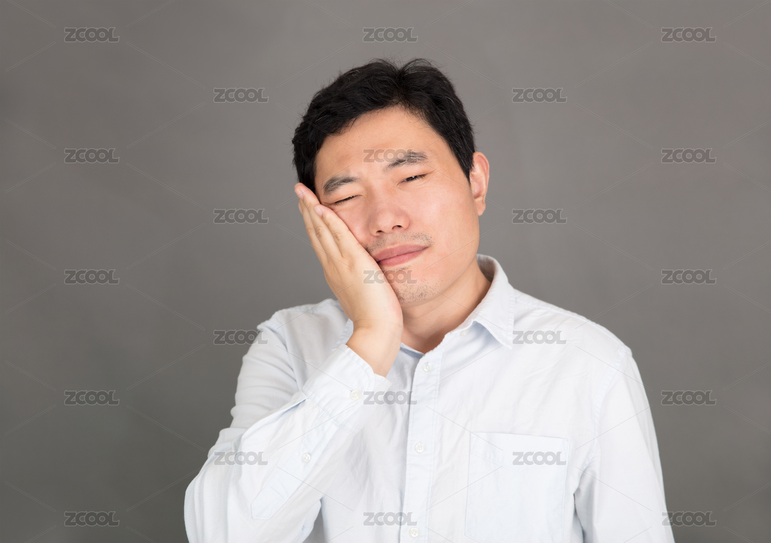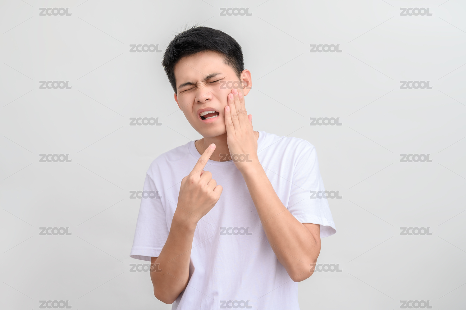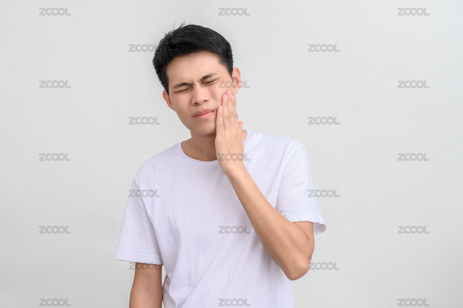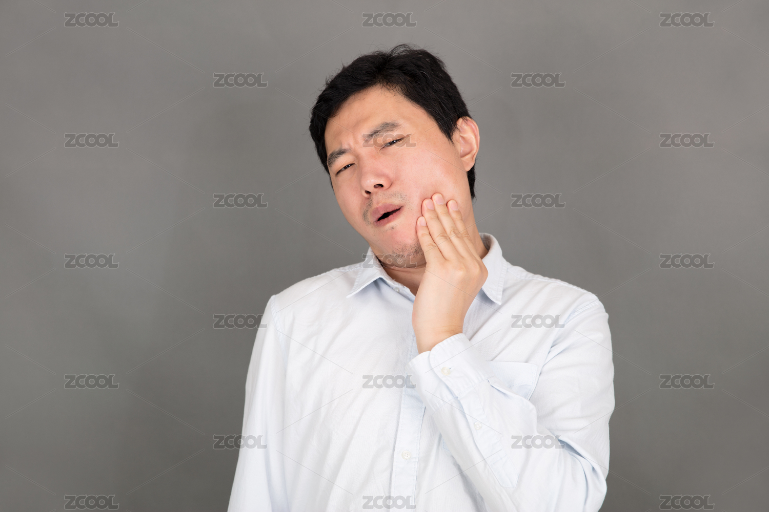 一個亞洲中國人摸著自己神經(jīng)疼痛酸痛的牙周炎的牙齒