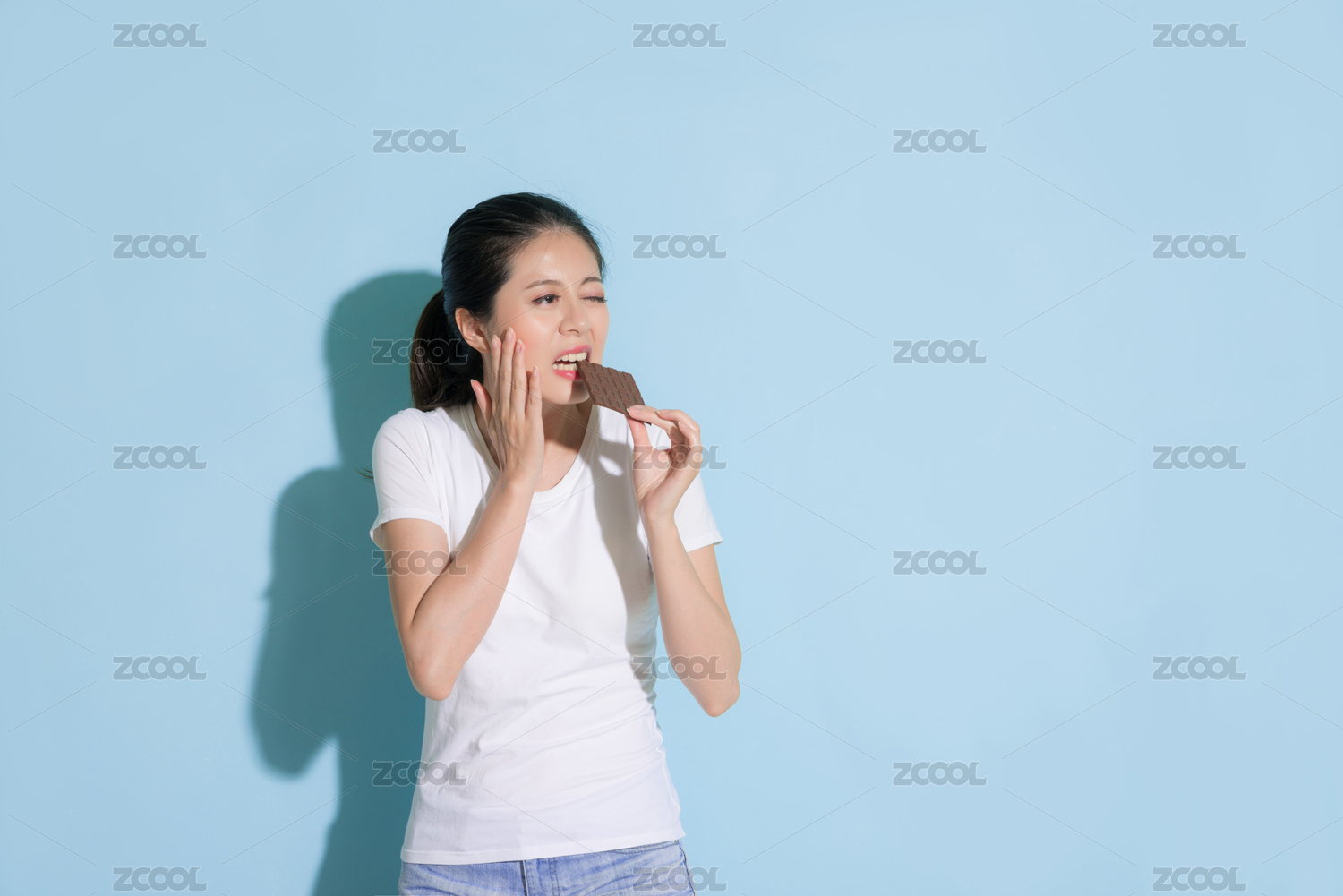 美麗漂亮的女人吃巧克力的感覺蛀牙痛站在藍(lán)色背景。