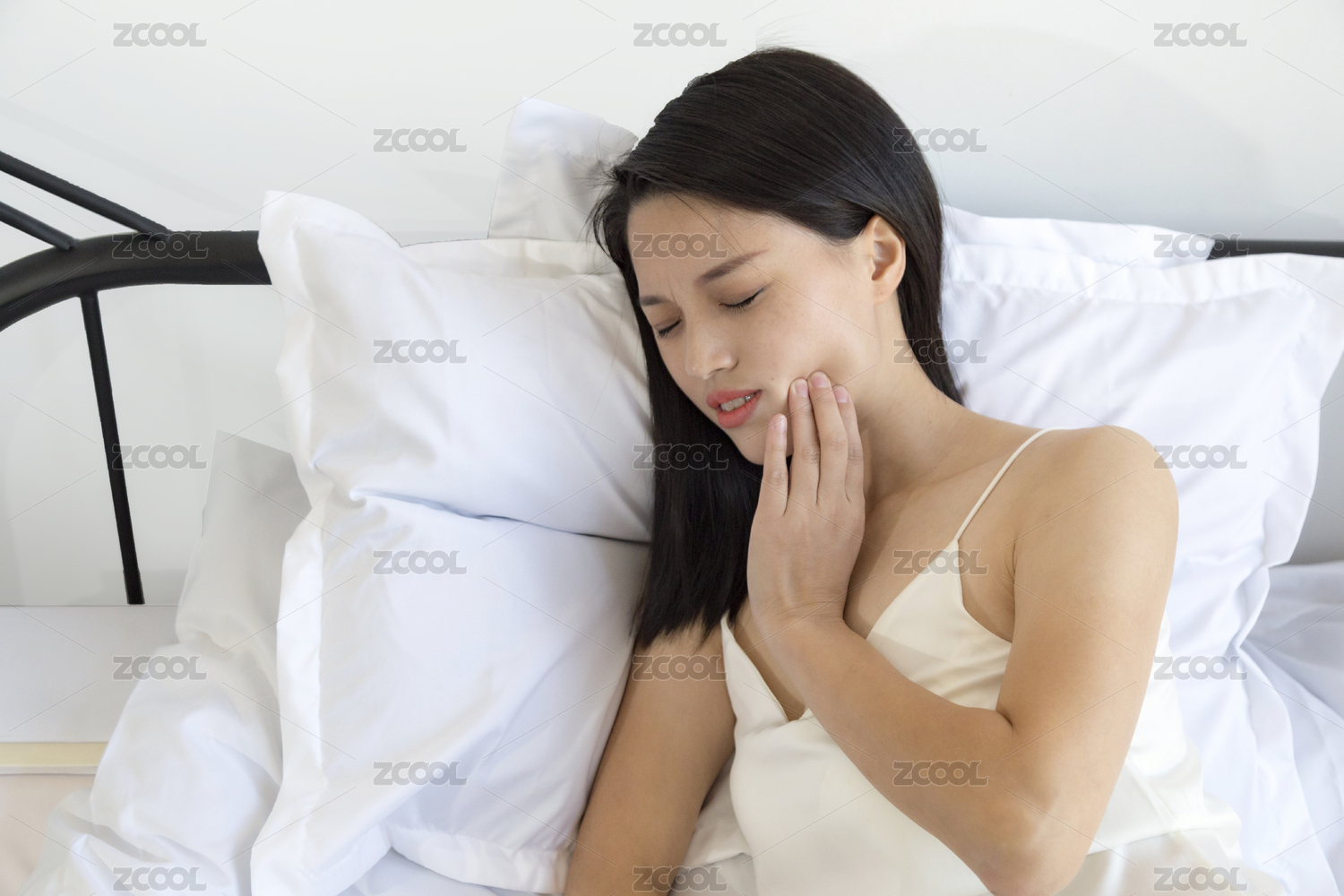 而在家里坐在沙發(fā)上牙痛年輕女子撫摸她的臉頰,保持閉眼。生活方式和健康理念的混血亞洲的中國模式。