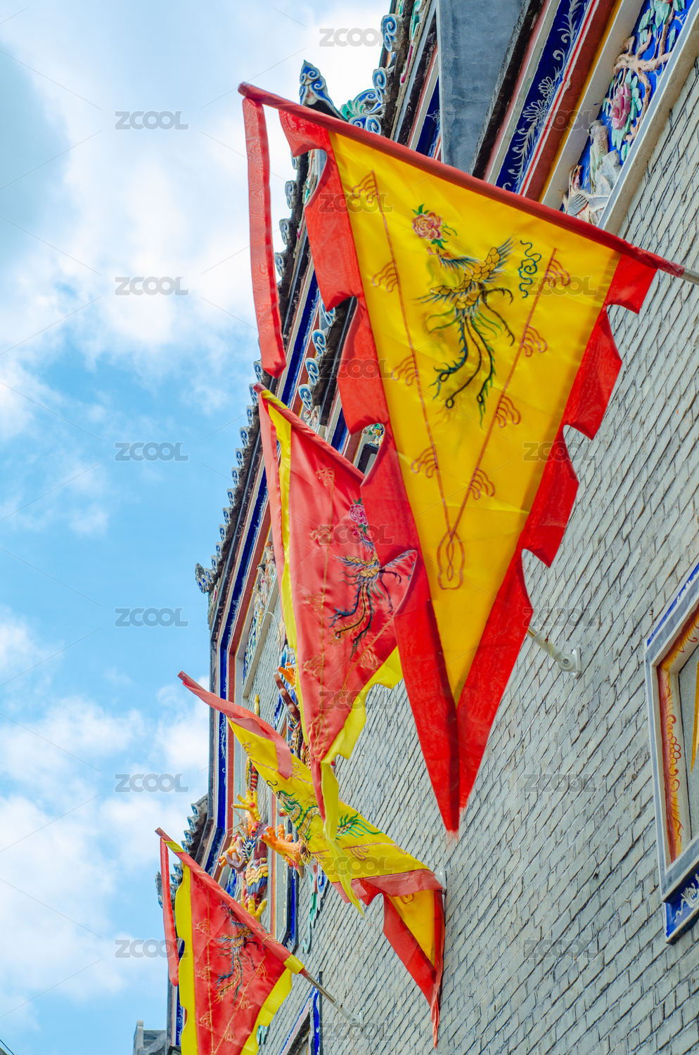 福州上下杭古建筑外懸掛龍鳳圖案旗幟