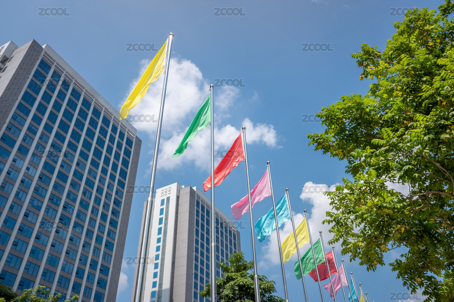 藍(lán)天白云下的高樓前飄揚(yáng)著五彩旗幟