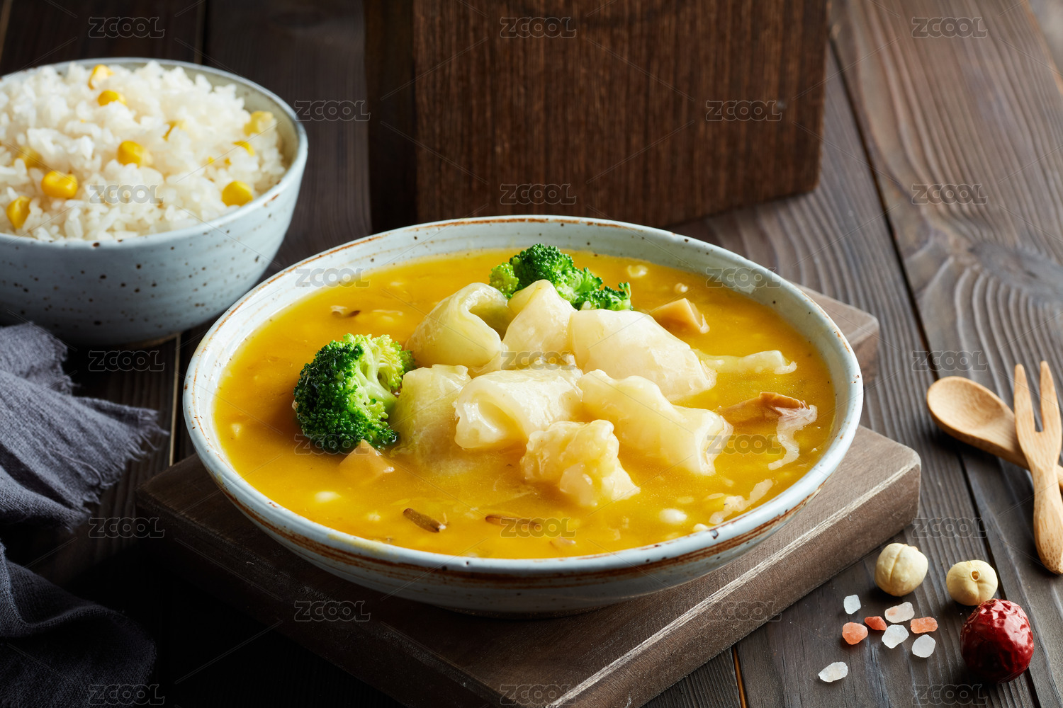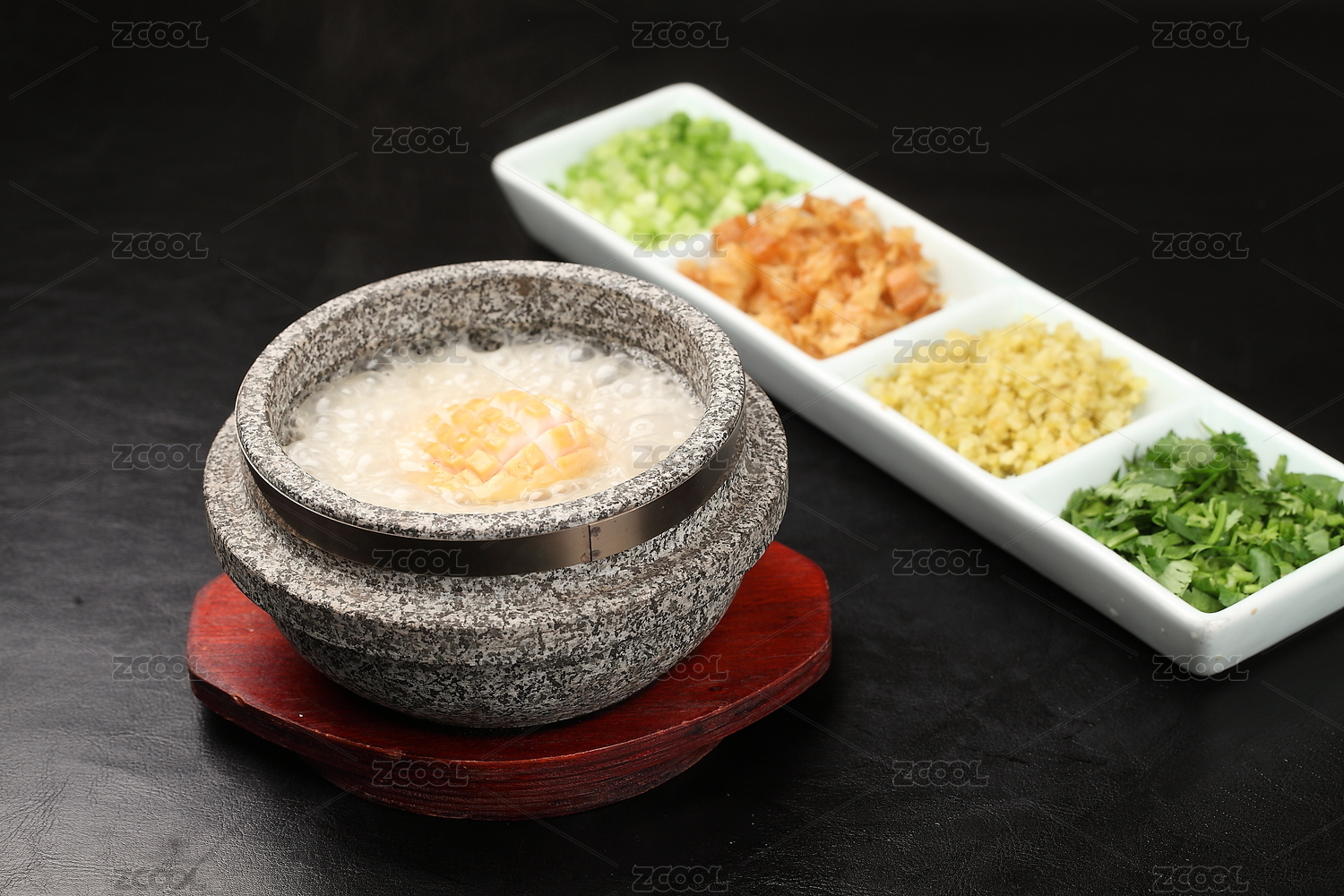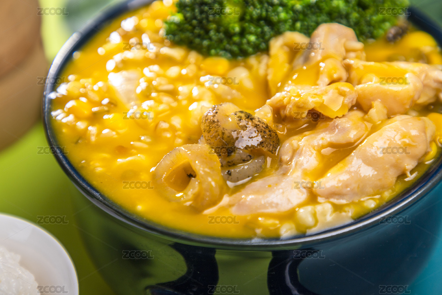 藍綠色卡紙上放著一份雜糧海參雞撈飯