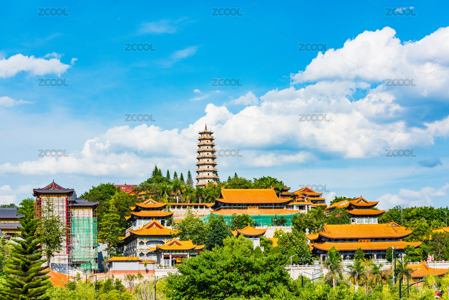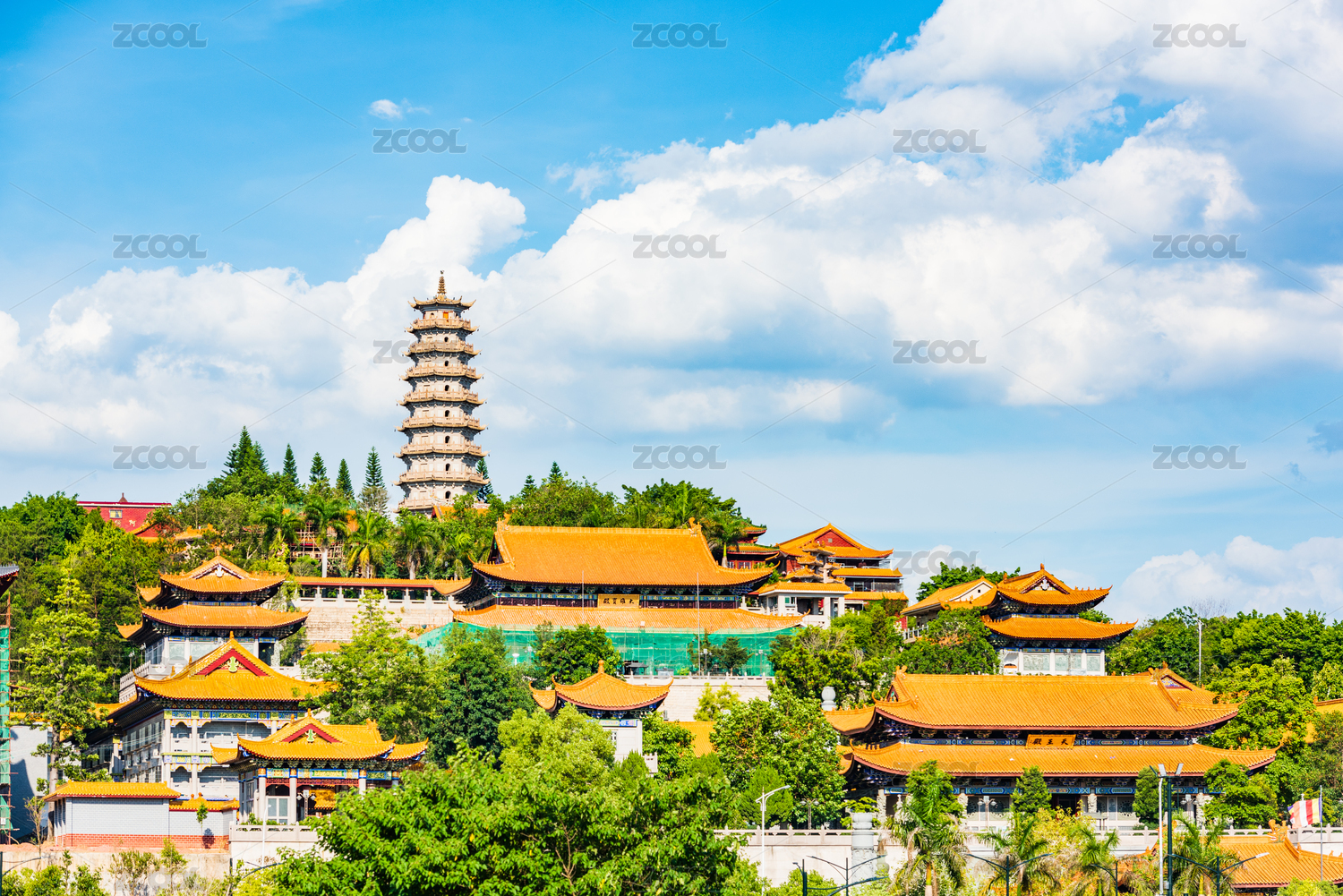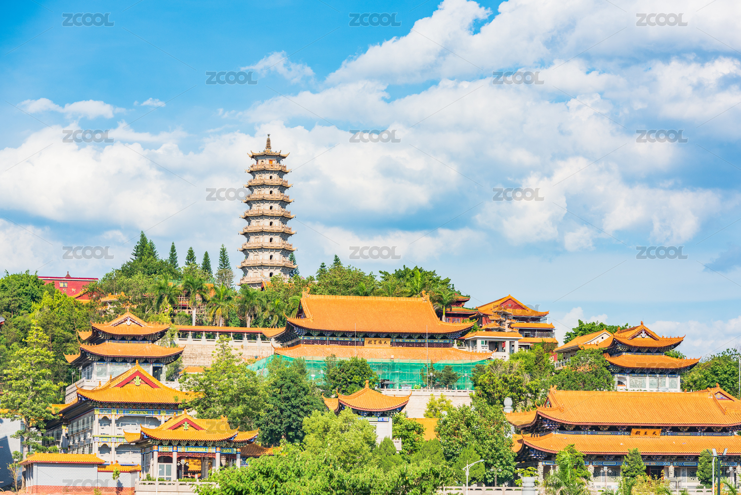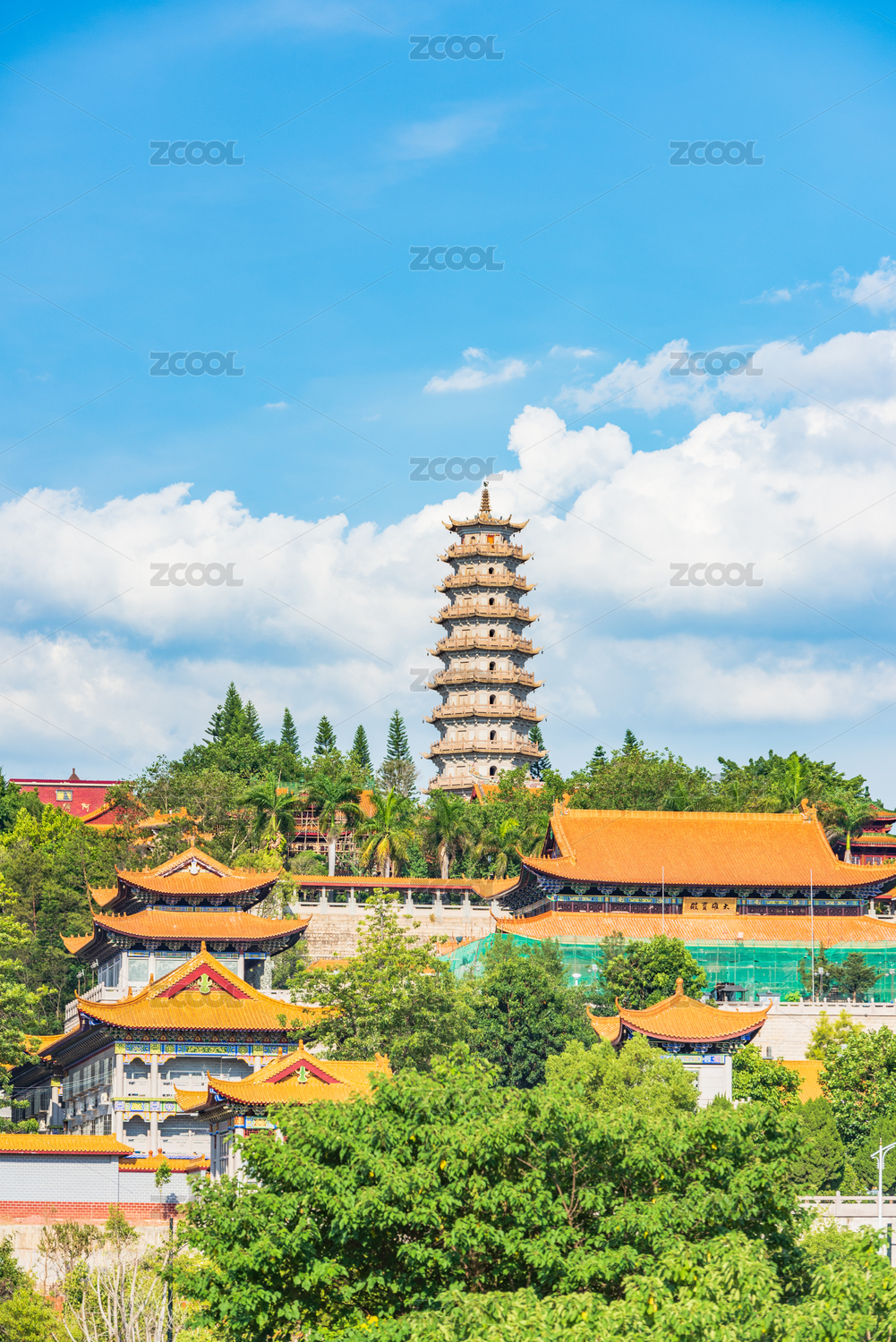 廣東梅州夏日午后藍天白云下的千佛塔寺