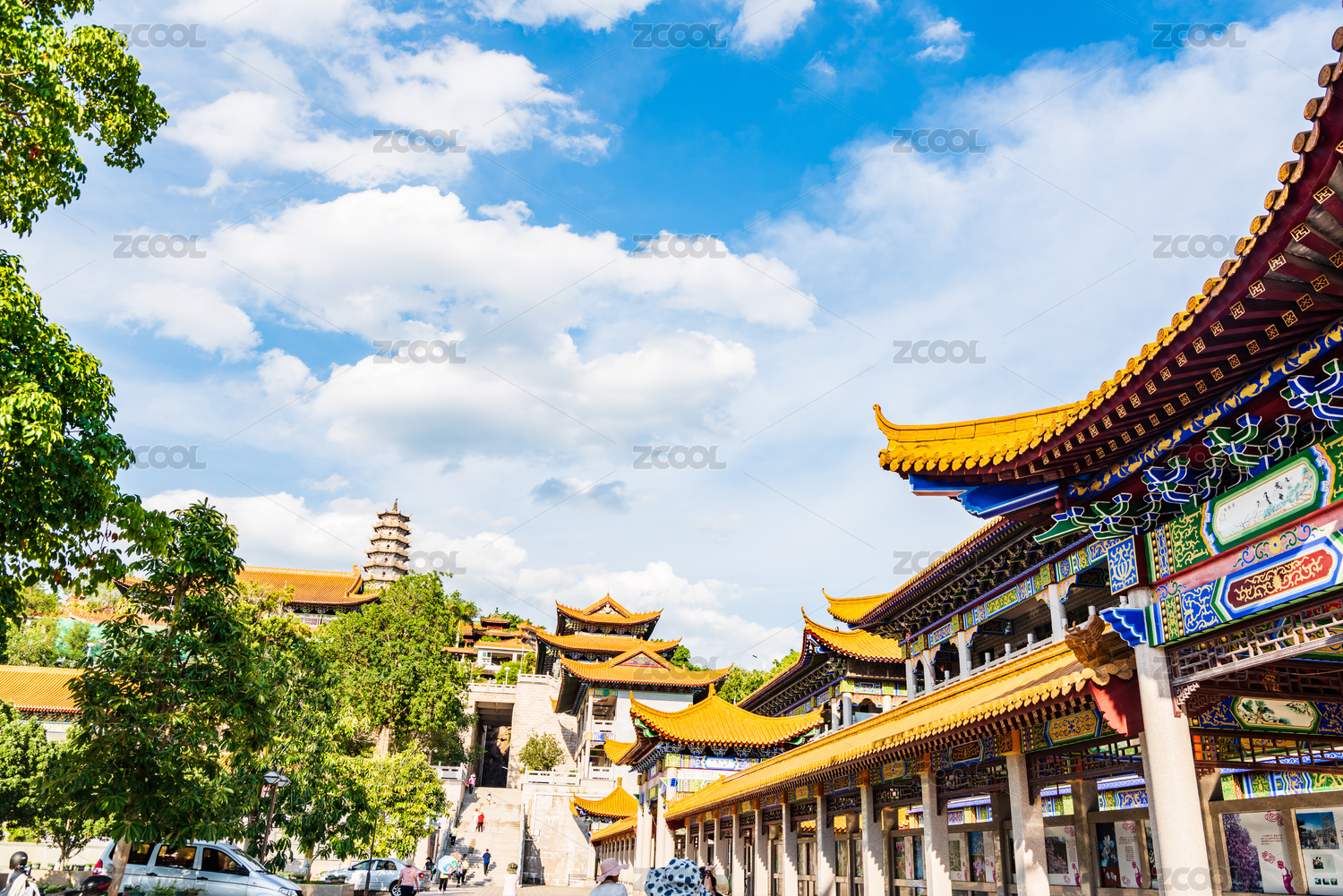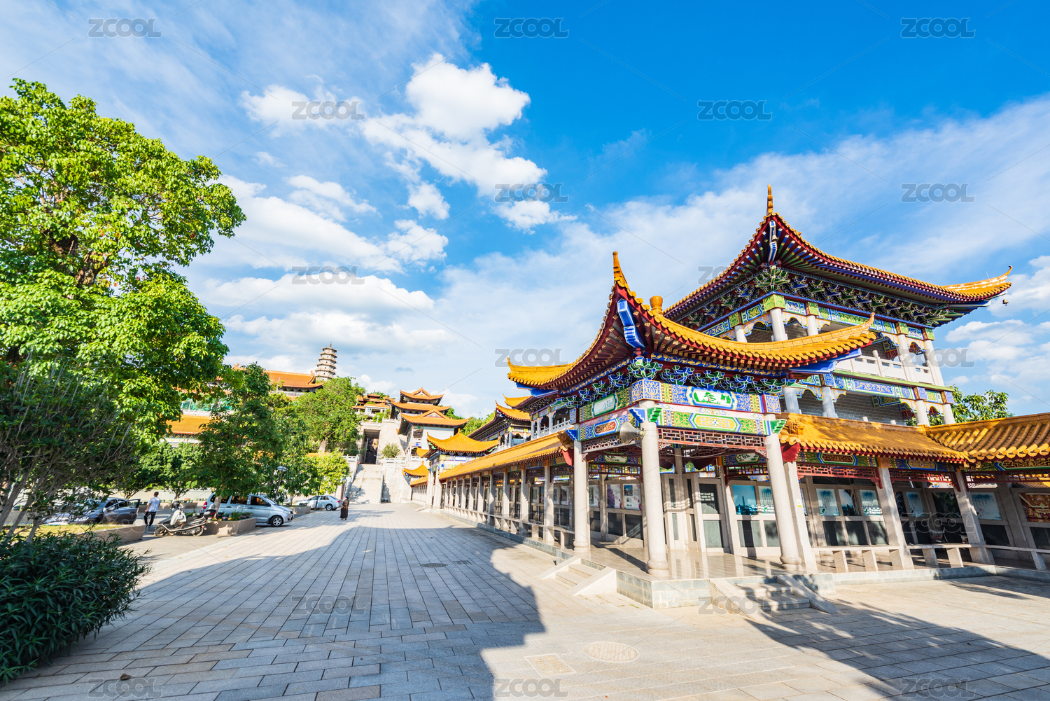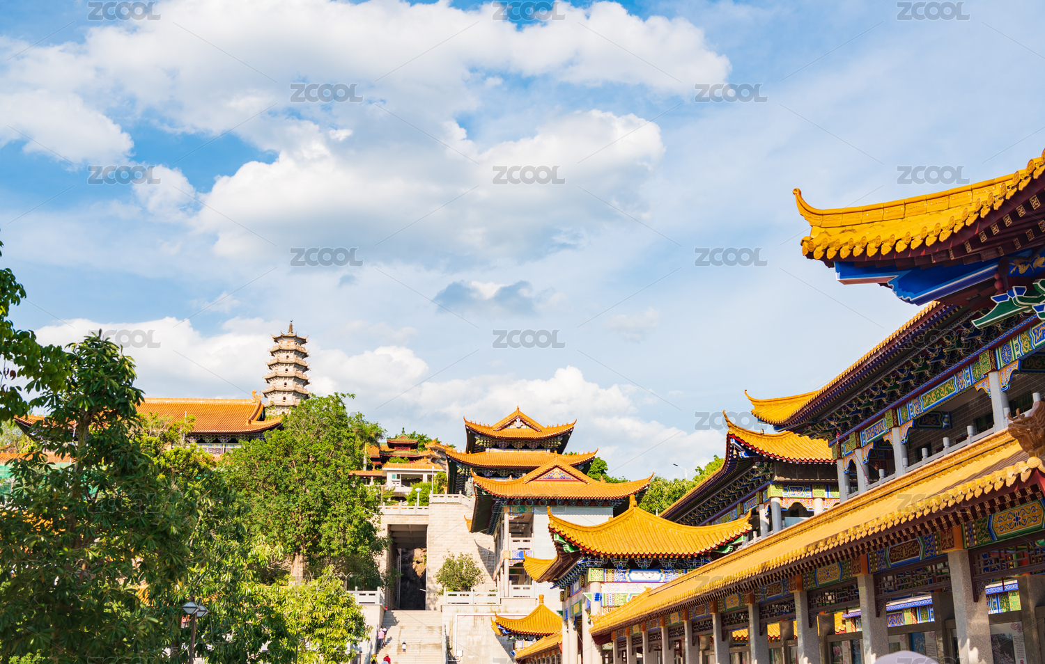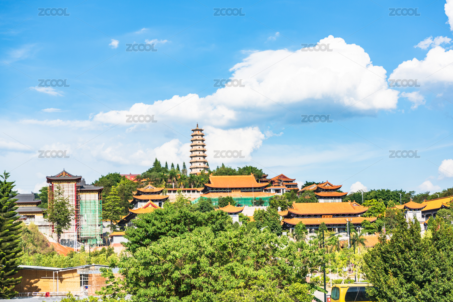 廣東梅州夏日午后藍天白云下的千佛塔寺