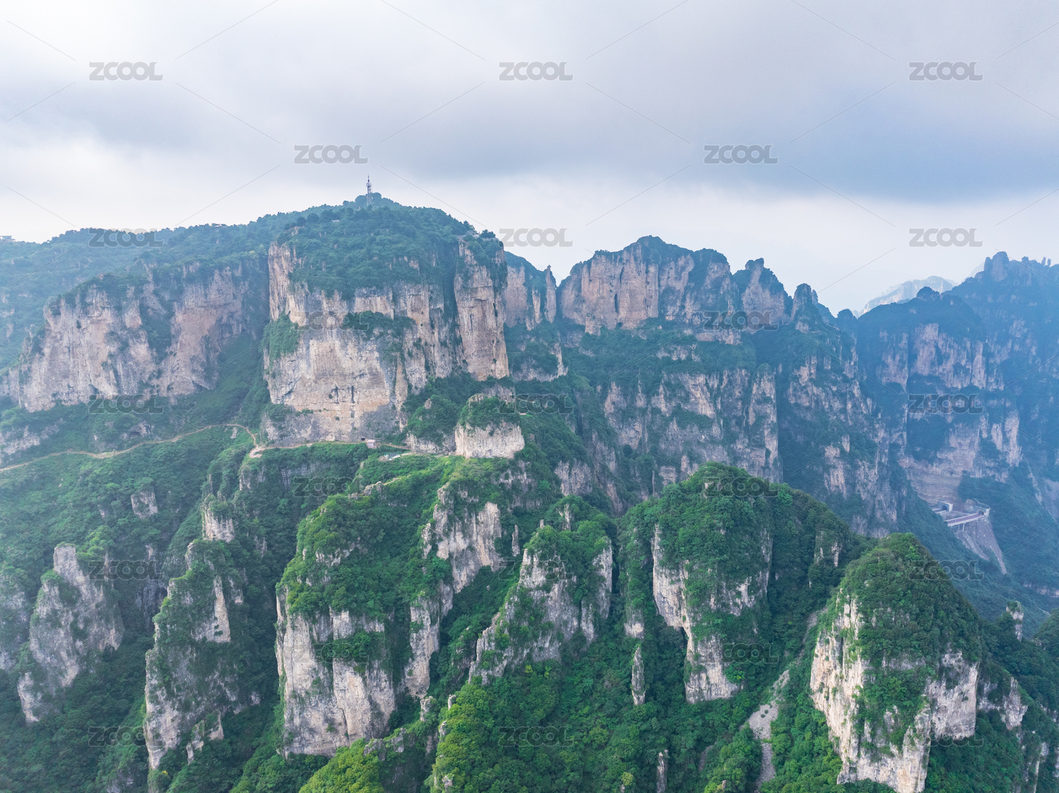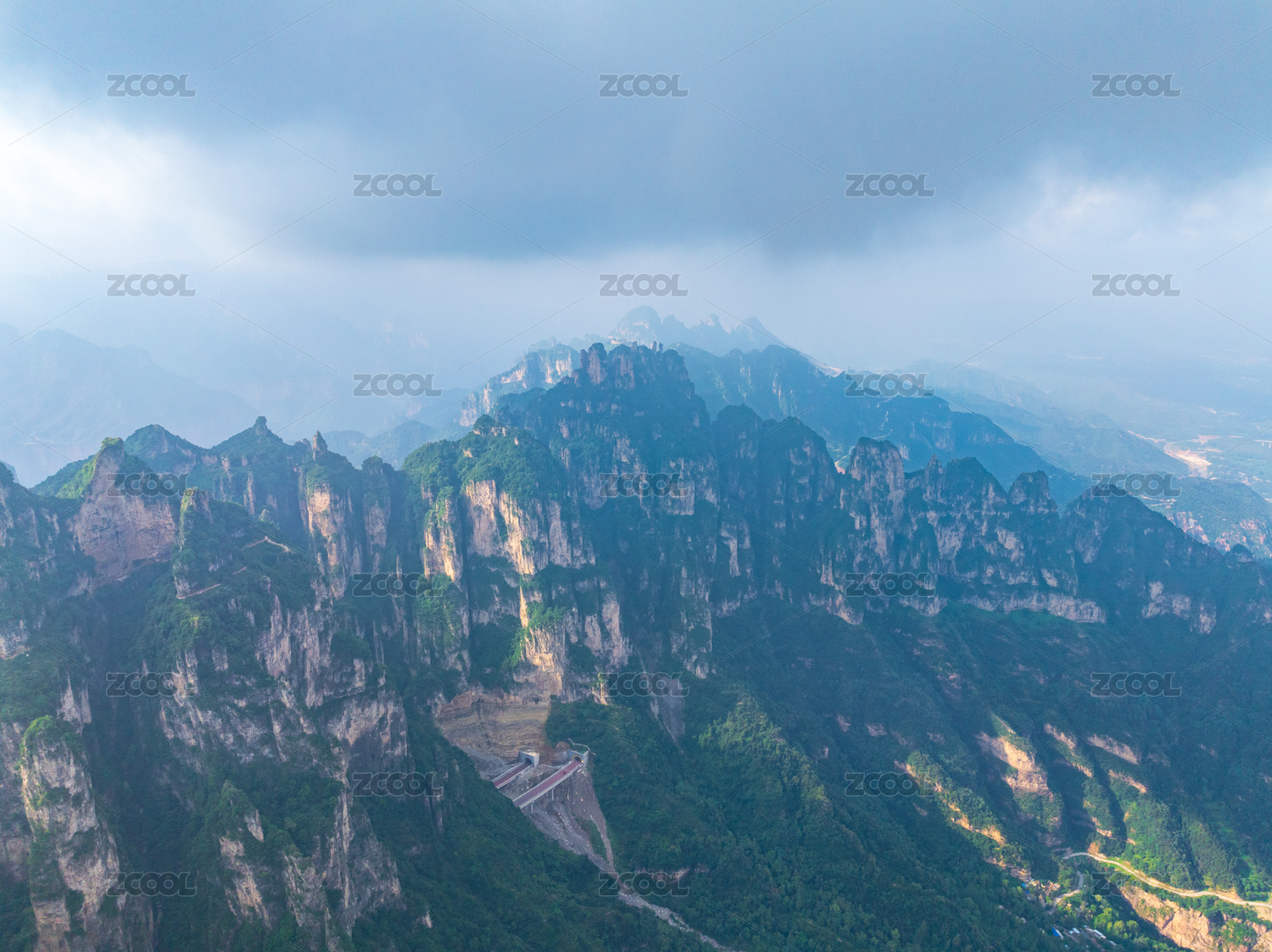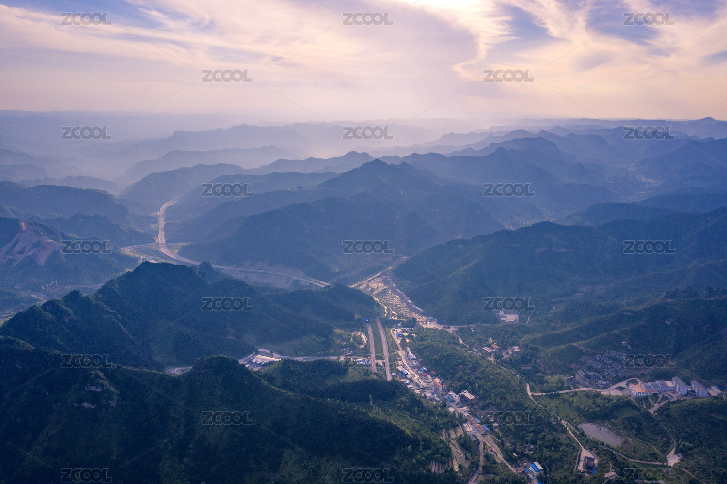 航拍中國(guó)山西太行山晨輝中的王莽嶺景區(qū)入口