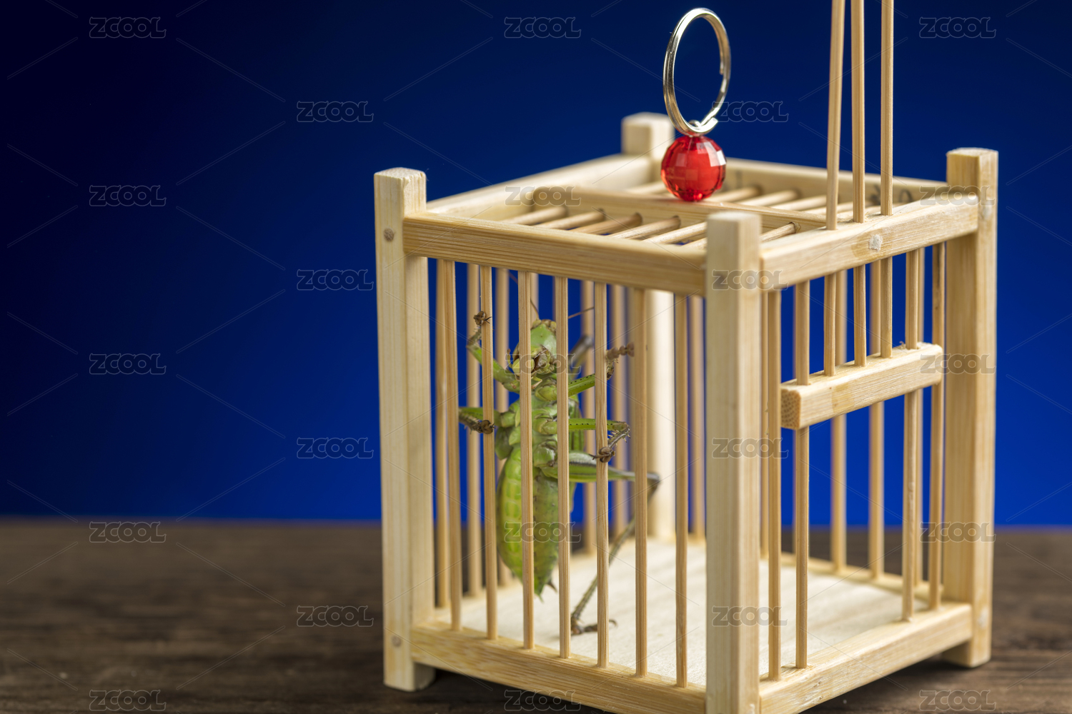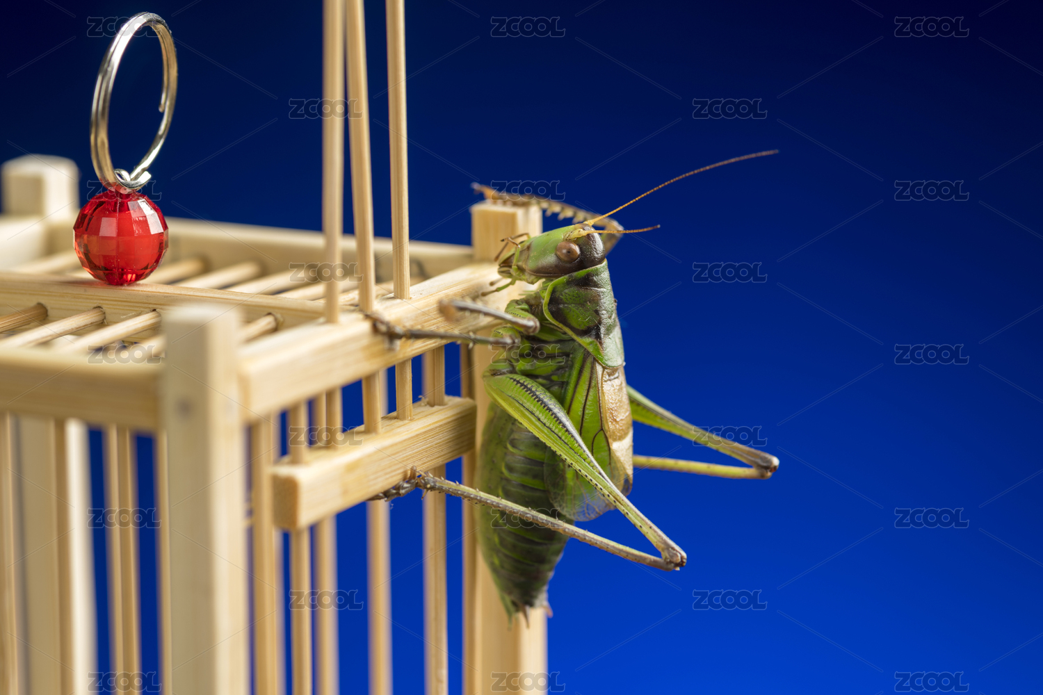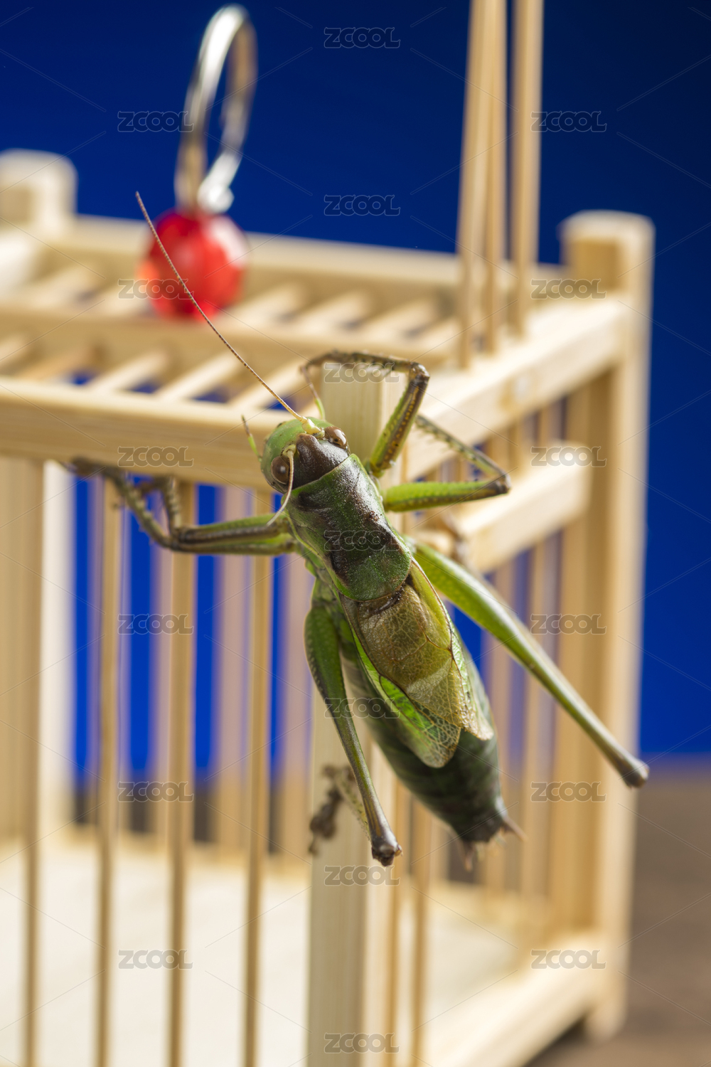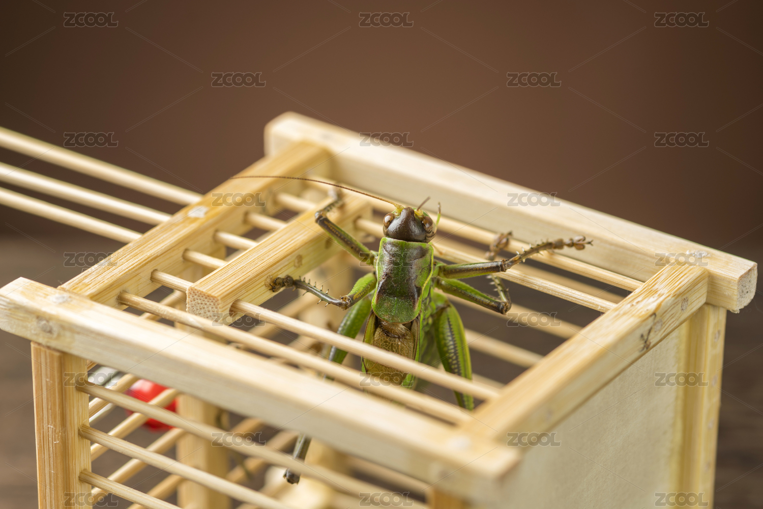 關(guān)在蟈蟈籠子中的螽斯科鳴蟲蟈蟈特寫