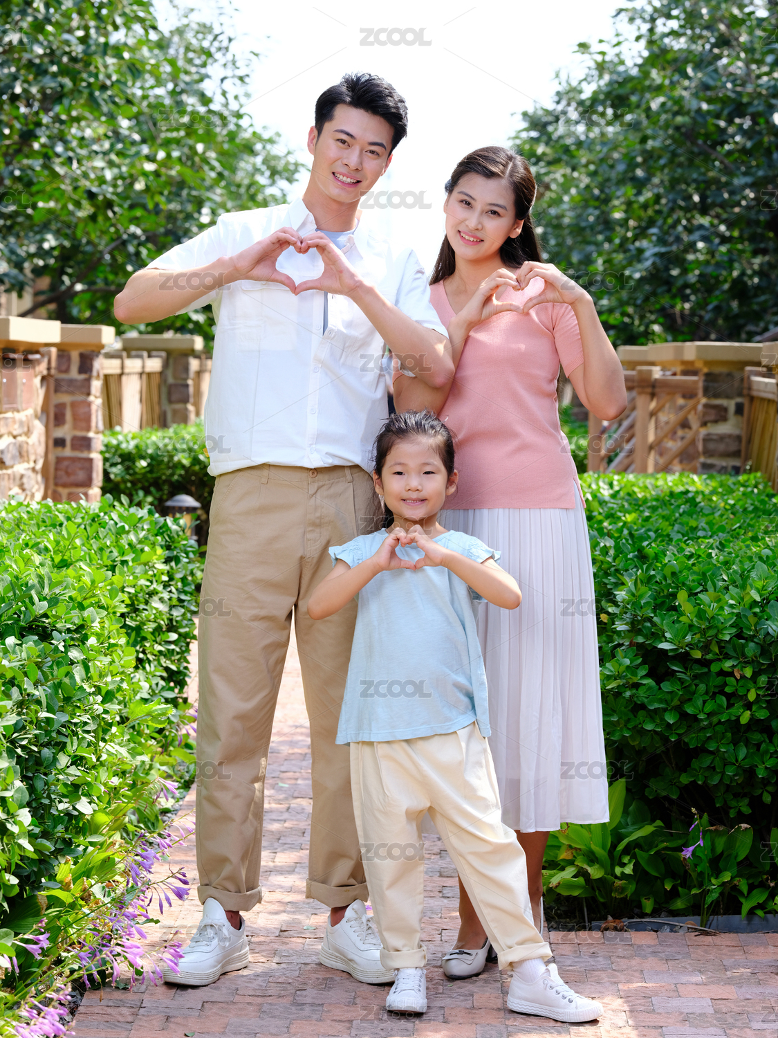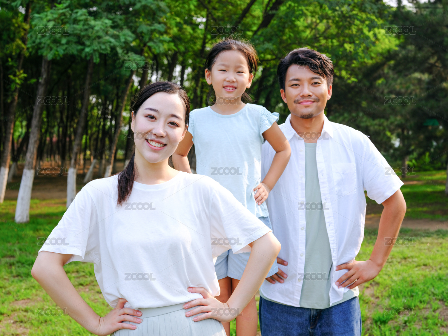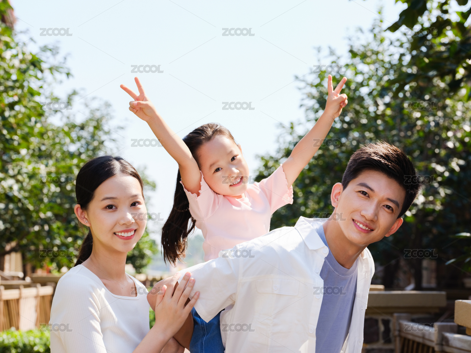 快樂的三口之家在戶外合影