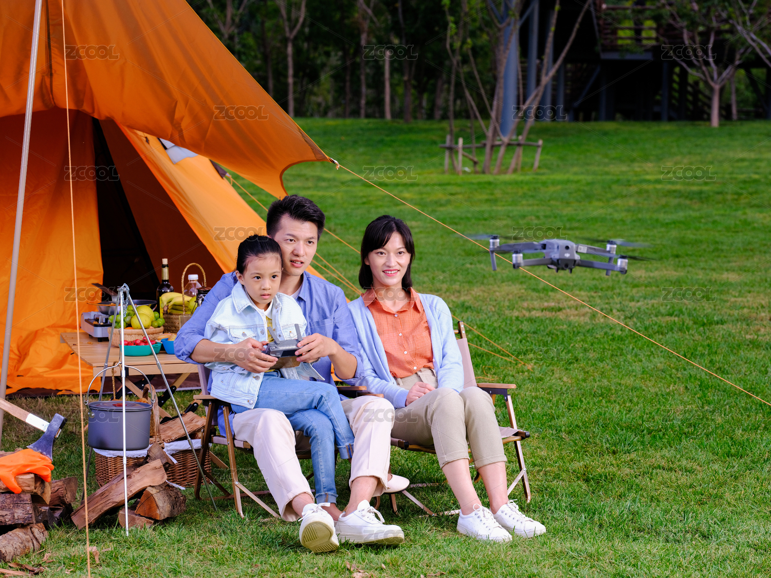 快樂的三口之家在公園操控?zé)o人機(jī)