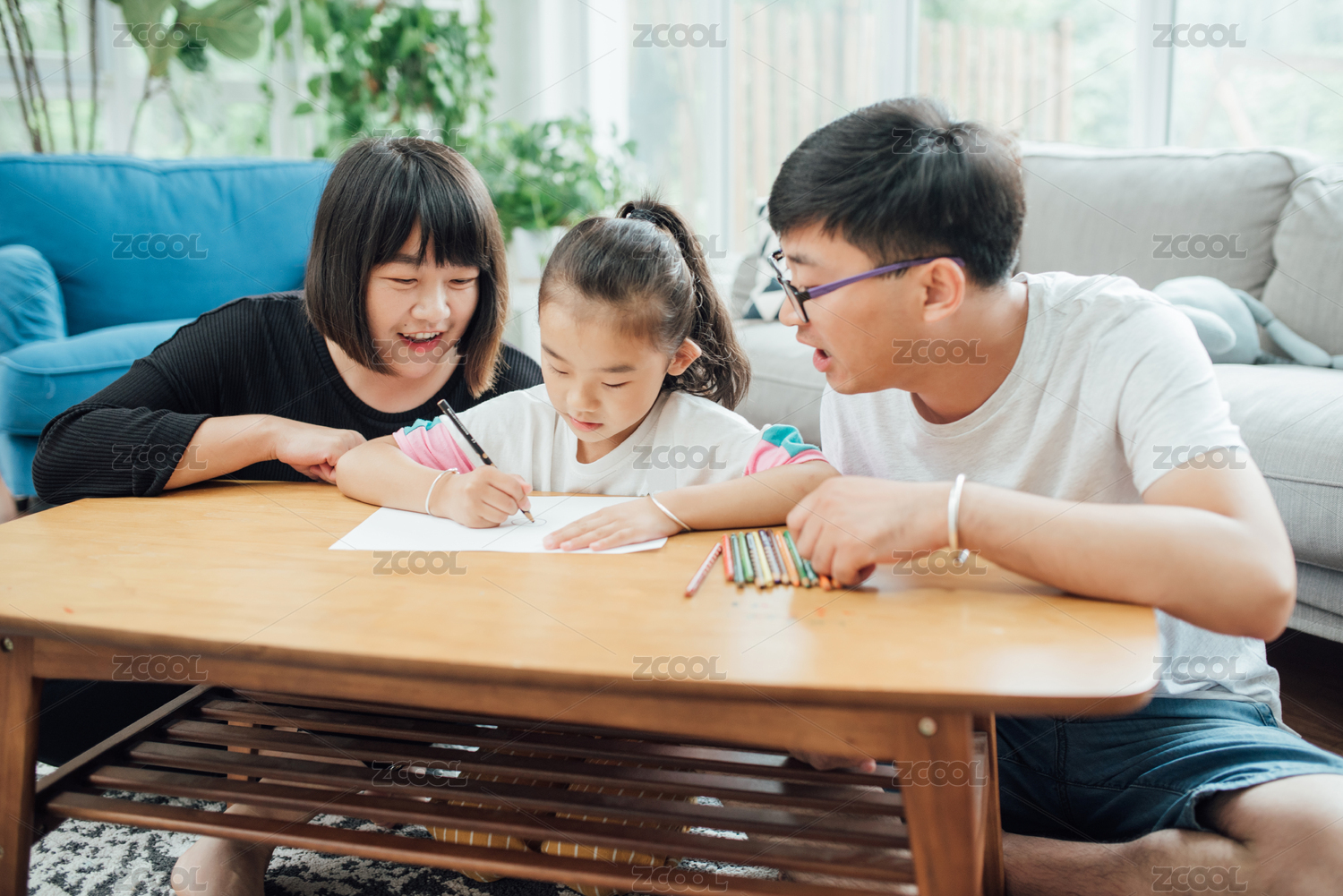 年輕的父母正在和孩子一起畫畫玩耍