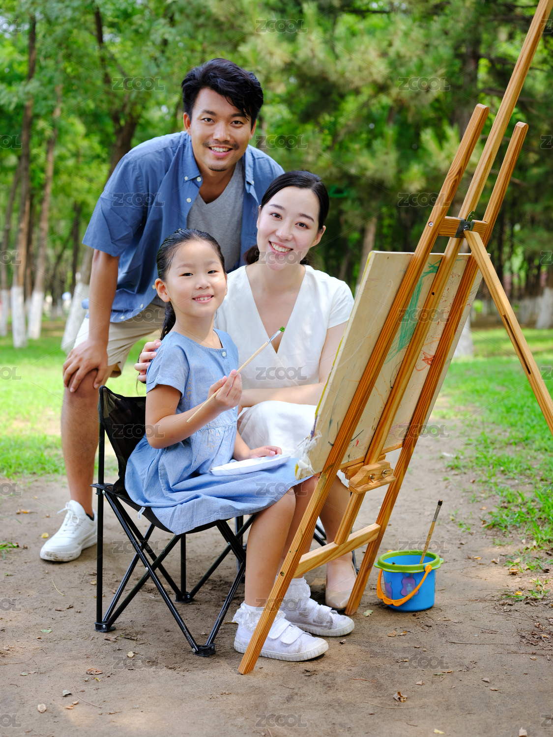 快樂的一家三口在戶外畫畫